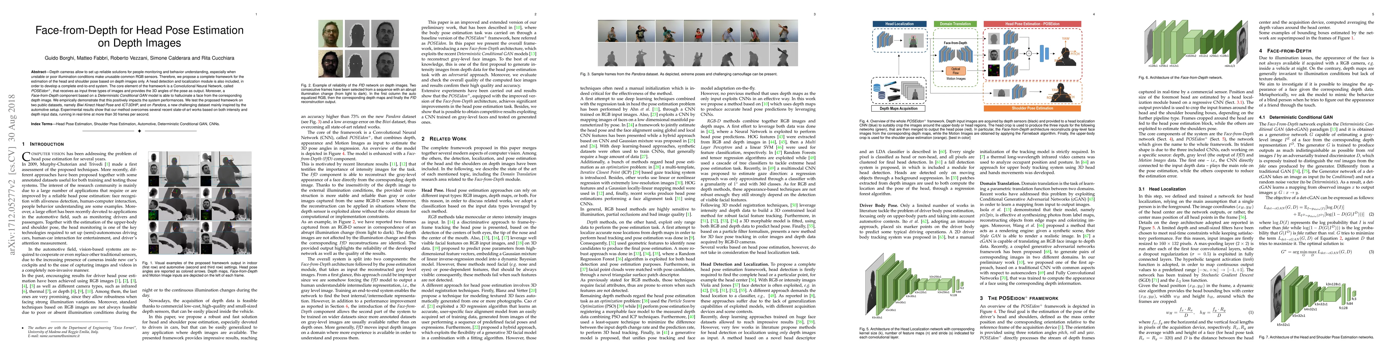 Depth cameras allow to set up reliable solutions for people monitoring and behavior understanding, especially when unstable or poor illumination conditions make unusable common RGB sensors. Therefore, we propose a complete framework for the estimation of the head and shoulder pose based on depth images only. A head detection and localization module is also included, in order to develop a complete end-to-end system. The core element of the framework is a Convolutional Neural Network, called POSEidon+, that receives as input three types of images and provides the 3D angles of the pose as output. Moreover, a Face-from-Depth component based on a Deterministic Conditional GAN model is able to hallucinate a face from the corresponding depth image. We empirically demonstrate that this positively impacts the system performances. We test the proposed framework on two public datasets, namely Biwi Kinect Head Pose and ICT-3DHP, and on Pandora, a new challenging dataset mainly inspired by the automotive setup. Experimental results show that our method overcomes several recent state-of-art works based on both intensity and depth input data, running in real-time at more than 30 frames per second.