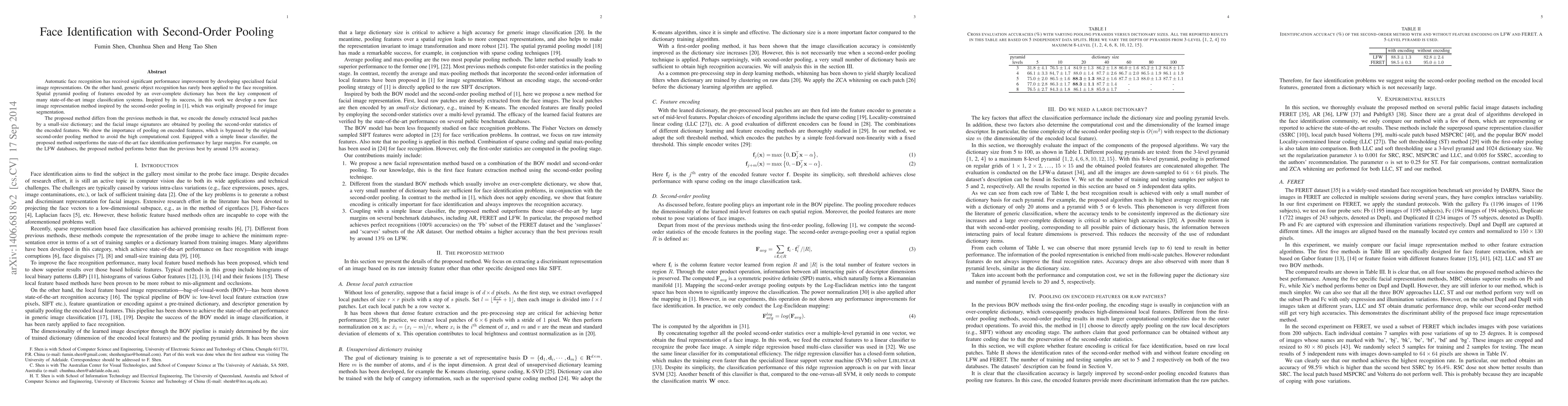 This paper proposes a new face image representation method using second-order pooling, which encodes local patches with a small-size dictionary and pools second-order statistics of encoded features, achieving superior face identification performance over state-of-the-art methods, notably improving accuracy by around 13% on the LFW database.