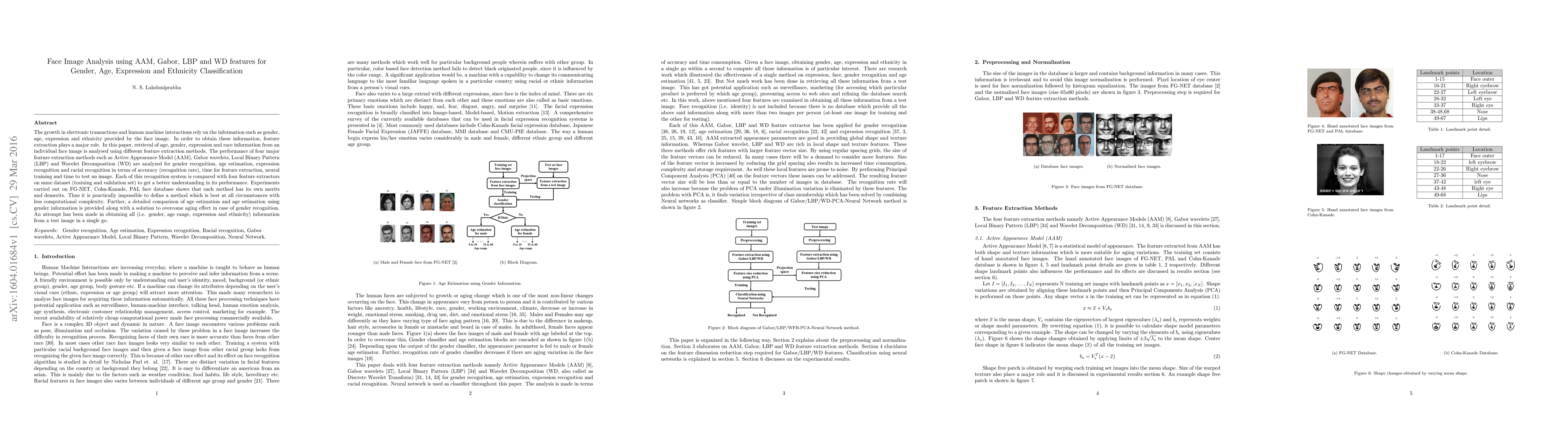 This research evaluates four feature extraction methods—Active Appearance Model (AAM), Gabor wavelets, Local Binary Pattern (LBP), and Wavelet Decomposition (WD)—for classifying gender, age, expression, and ethnicity from face images. Each method is assessed on FG-NET, Cohn-Kanade, and PAL face databases for accuracy, computational efficiency, and performance trade-offs, revealing no single best method across all tasks.