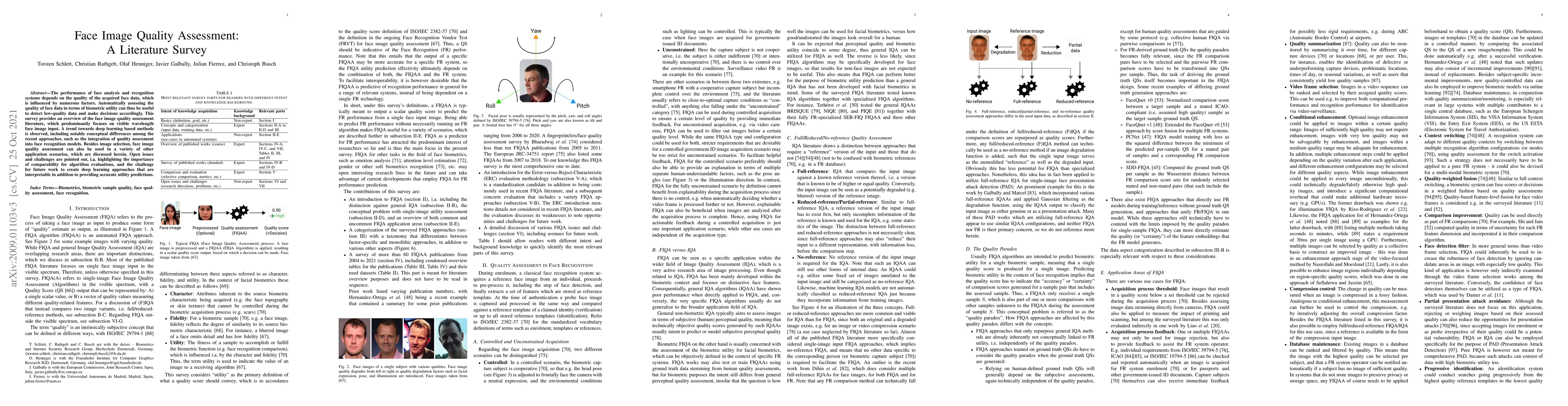 This paper surveys face image quality assessment methods, focusing on visible wavelength inputs and noting a shift towards deep learning. It highlights the integration of quality assessment into face recognition models, discusses various application scenarios, and identifies challenges such as comparability and the need for interpretable deep learning approaches.
