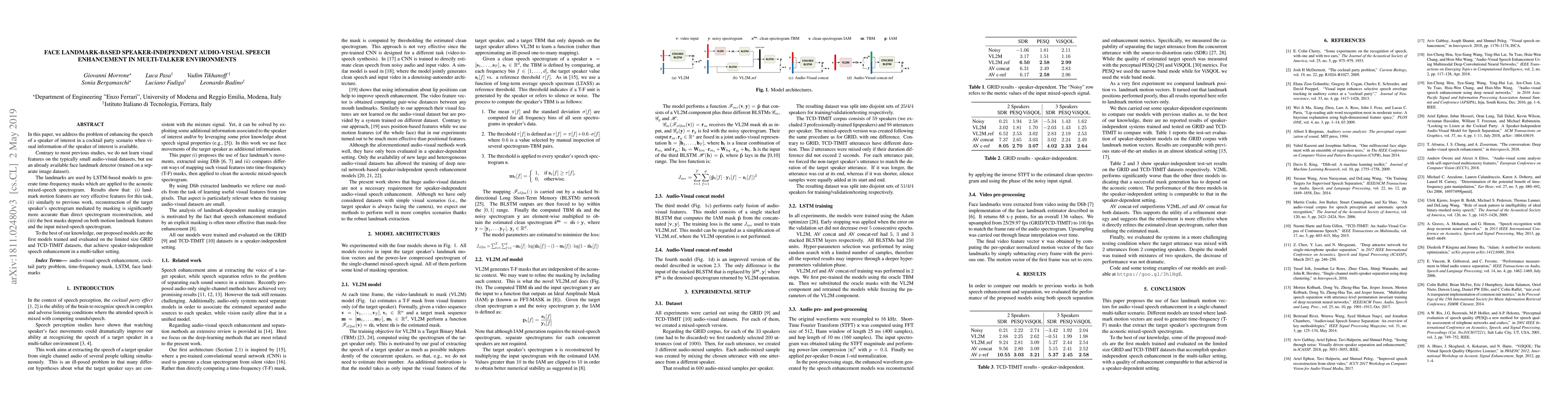 In this paper, we address the problem of enhancing the speech of a speaker of interest in a cocktail party scenario when visual information of the speaker of interest is available. Contrary to most previous studies, we do not learn visual features on the typically small audio-visual datasets, but use an already available face landmark detector (trained on a separate image dataset). The landmarks are used by LSTM-based models to generate time-frequency masks which are applied to the acoustic mixed-speech spectrogram. Results show that: (i) landmark motion features are very effective features for this task, (ii) similarly to previous work, reconstruction of the target speaker's spectrogram mediated by masking is significantly more accurate than direct spectrogram reconstruction, and (iii) the best masks depend on both motion landmark features and the input mixed-speech spectrogram. To the best of our knowledge, our proposed models are the first models trained and evaluated on the limited size GRID and TCD-TIMIT datasets, that achieve speaker-independent speech enhancement in a multi-talker setting.