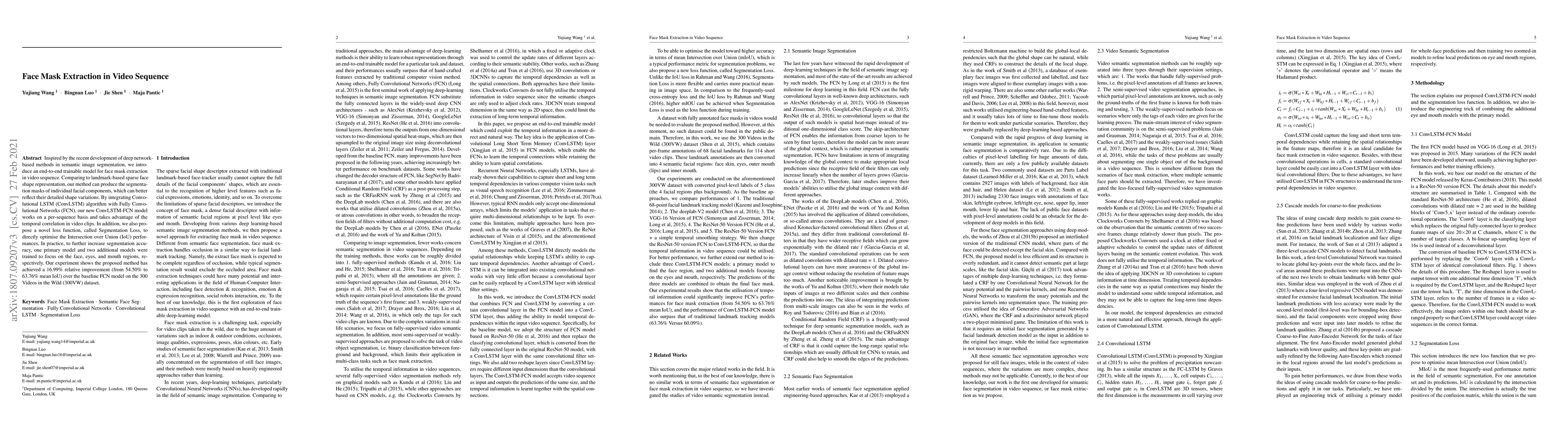 Inspired by the recent development of deep network-based methods in semantic image segmentation, we introduce an end-to-end trainable model for face mask extraction in video sequence. Comparing to landmark-based sparse face shape representation, our method can produce the segmentation masks of individual facial components, which can better reflect their detailed shape variations. By integrating Convolutional LSTM (ConvLSTM) algorithm with Fully Convolutional Networks (FCN), our new ConvLSTM-FCN model works on a per-sequence basis and takes advantage of the temporal correlation in video clips. In addition, we also propose a novel loss function, called Segmentation Loss, to directly optimise the Intersection over Union (IoU) performances. In practice, to further increase segmentation accuracy, one primary model and two additional models were trained to focus on the face, eyes, and mouth regions, respectively. Our experiment shows the proposed method has achieved a 16.99% relative improvement (from 54.50% to 63.76% mean IoU) over the baseline FCN model on the 300 Videos in the Wild (300VW) dataset.