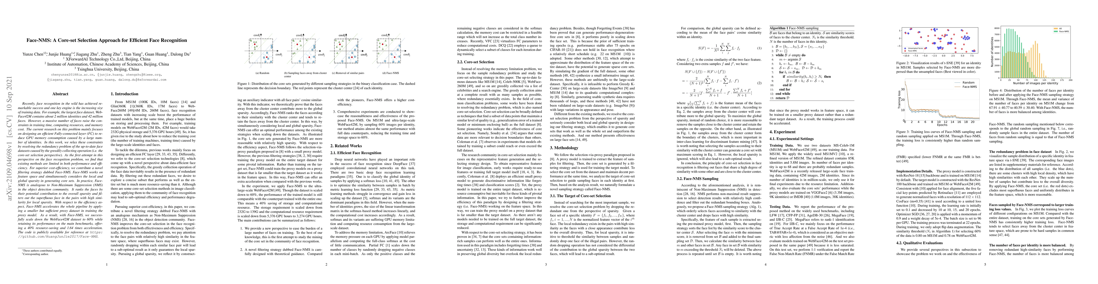 This paper introduces Face-NMS, a novel core-set selection approach to efficiently manage large face datasets for recognition. It addresses redundancy in massive datasets by filtering out similar faces to create a smaller, yet representative core set, achieving a 40% reduction in resource usage and a 1.64 times speedup while maintaining performance.