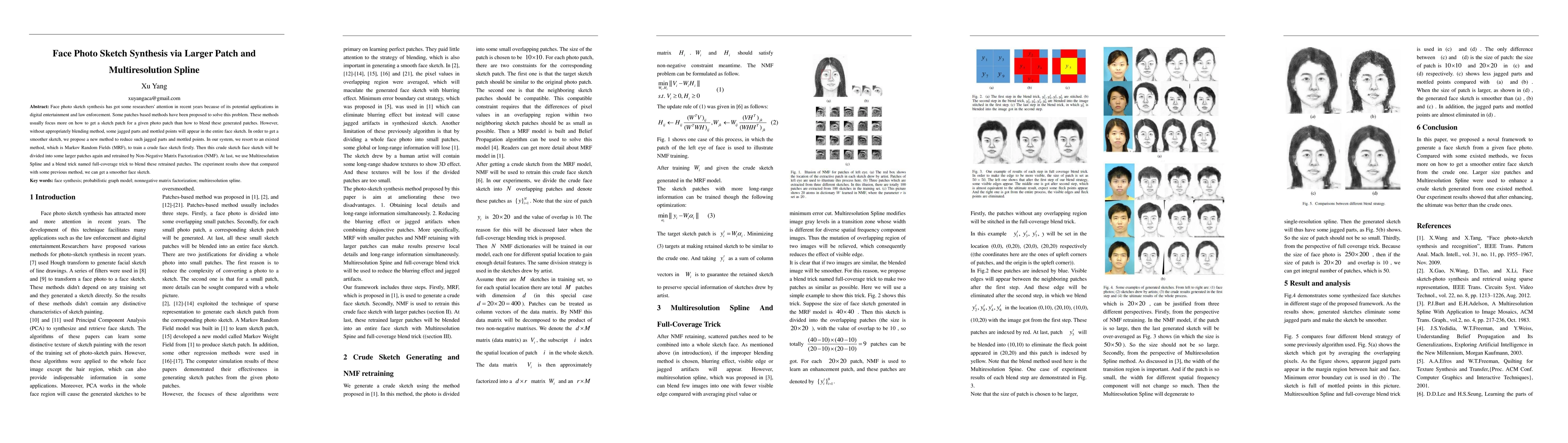 This paper proposes a method for synthesizing smoother face photo sketches by using larger patches and multiresolution spline blending. It combines Markov Random Fields and Non-Negative Matrix Factorization for initial sketch generation and refinement, followed by blending with a full-coverage trick to eliminate jagged parts and mottled points.