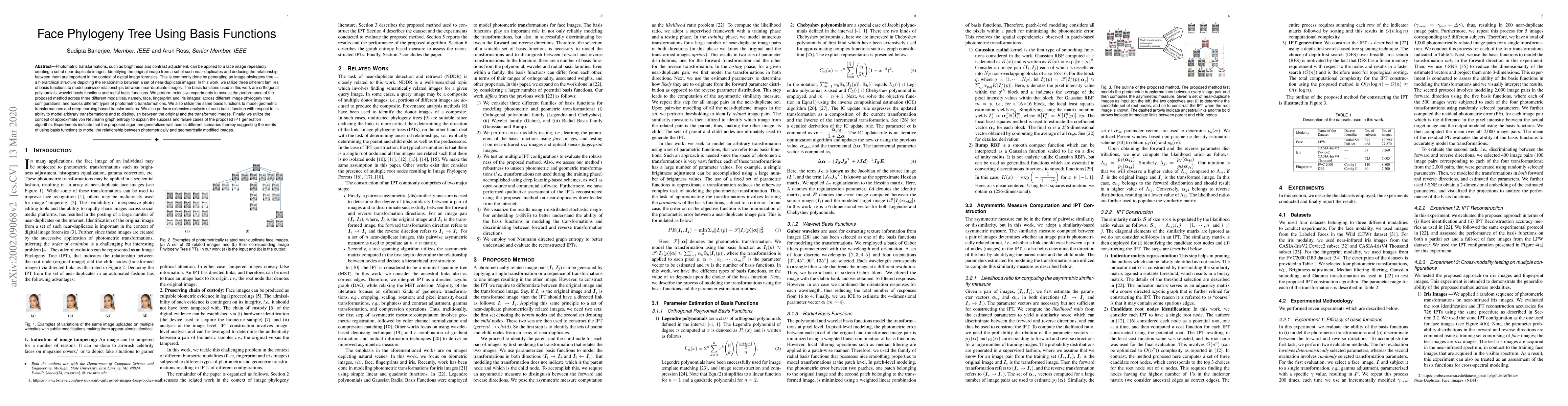 This paper proposes using basis functions like orthogonal polynomials, wavelet basis, and radial basis functions to model relationships between near-duplicate images, generating an image phylogeny tree for forensic analysis. The method is tested across face, fingerprint, and iris images under various photometric transformations, demonstrating its effectiveness and generalizability.