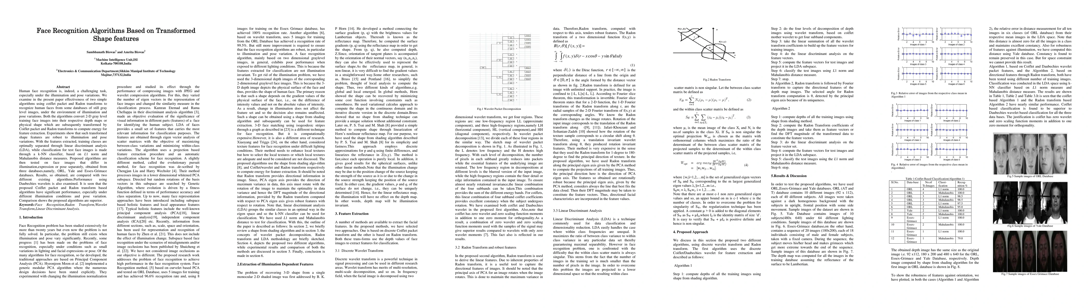 Human face recognition is, indeed, a challenging task, especially under the illumination and pose variations. We examine in the present paper effectiveness of two simple algorithms using coiflet packet and Radon transforms to recognize human faces from some databases of still gray level images, under the environment of illumination and pose variations. Both the algorithms convert 2-D gray level training face images into their respective depth maps or physical shape which are subsequently transformed by Coiflet packet and Radon transforms to compute energy for feature extraction. Experiments show that such transformed shape features are robust to illumination and pose variations. With the features extracted, training classes are optimally separated through linear discriminant analysis (LDA), while classification for test face images is made through a k-NN classifier, based on L1 norm and Mahalanobis distance measures. Proposed algorithms are then tested on face images that differ in illumination,expression or pose separately, obtained from three databases,namely, ORL, Yale and Essex-Grimace databases. Results, so obtained, are compared with two different existing algorithms.Performance using Daubechies wavelets is also examined. It is seen that the proposed Coiflet packet and Radon transform based algorithms have significant performance, especially under different illumination conditions and pose variation. Comparison shows the proposed algorithms are superior.