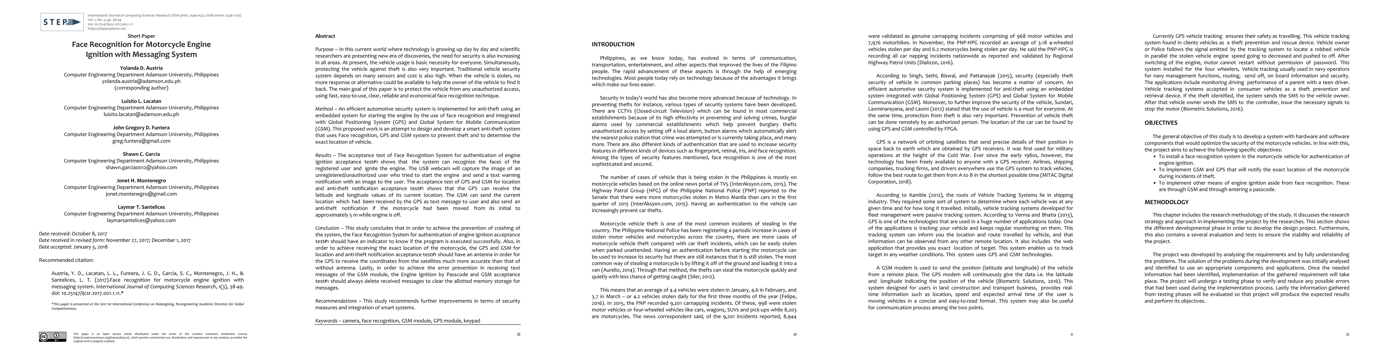 This paper proposes a smart anti-theft system for motorcycles using face recognition for engine ignition, integrated with GPS and GSM to prevent theft and locate the vehicle. The system aims to provide a secure, cost-effective, and reliable solution to vehicle theft.