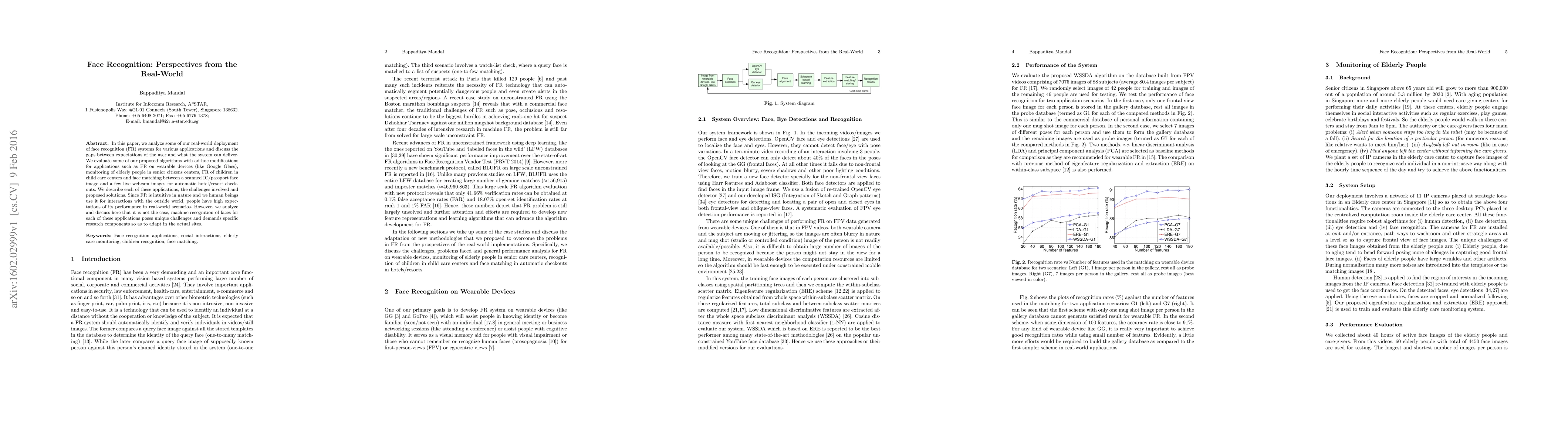 In this paper, we analyze some of our real-world deployment of face recognition (FR) systems for various applications and discuss the gaps between expectations of the user and what the system can deliver. We evaluate some of our proposed algorithms with ad-hoc modifications for applications such as FR on wearable devices (like Google Glass), monitoring of elderly people in senior citizens centers, FR of children in child care centers and face matching between a scanned IC/passport face image and a few live webcam images for automatic hotel/resort checkouts. We describe each of these applications, the challenges involved and proposed solutions. Since FR is intuitive in nature and we human beings use it for interactions with the outside world, people have high expectations of its performance in real-world scenarios. However, we analyze and discuss here that it is not the case, machine recognition of faces for each of these applications poses unique challenges and demands specific research components so as to adapt in the actual sites.