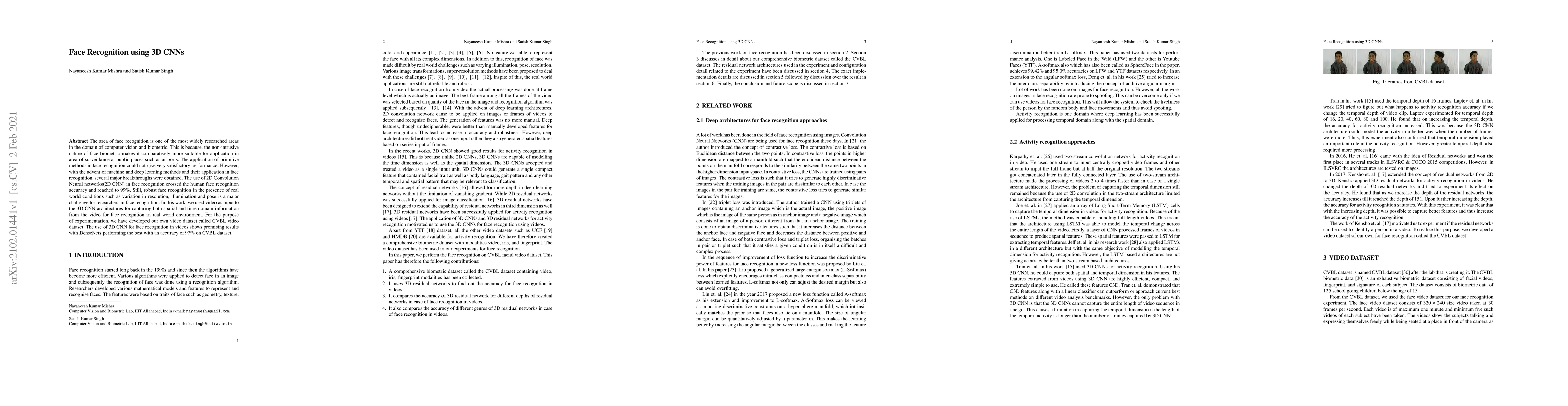 This paper explores the use of 3D Convolutional Neural Networks (3D CNNs) for face recognition in videos, capturing spatial and temporal information to improve accuracy in real-world conditions. Experiments on a self-developed CVBL video dataset show DenseNets achieving a 97% accuracy, demonstrating the potential of 3D CNNs over traditional 2D CNNs.