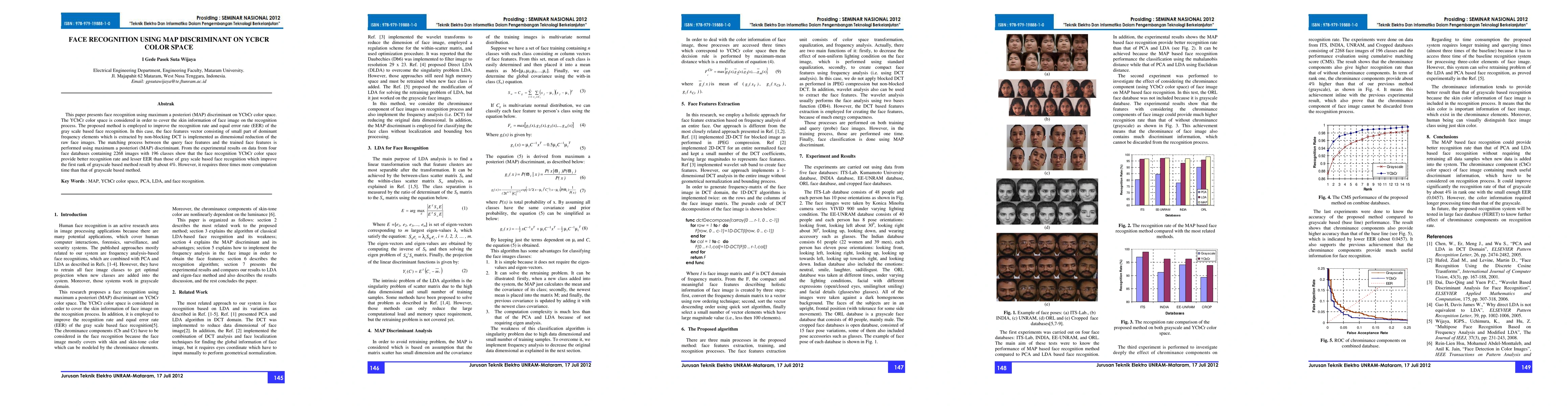 This paper proposes a face recognition method using maximum a posteriori discriminant in YCbCr color space, which enhances recognition rate and reduces equal error rate compared to grayscale methods. Despite requiring three times more computation, it improves first rank results by about 4%.