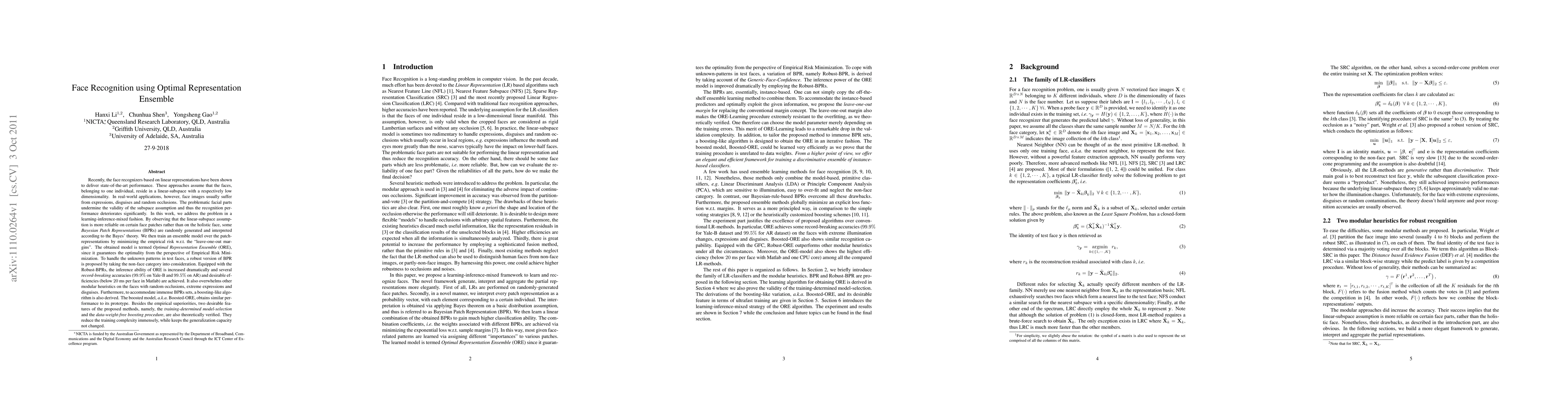 Recently, the face recognizers based on linear representations have been shown to deliver state-of-the-art performance. In real-world applications, however, face images usually suffer from expressions, disguises and random occlusions. The problematic facial parts undermine the validity of the linear-subspace assumption and thus the recognition performance deteriorates significantly. In this work, we address the problem in a learning-inference-mixed fashion. By observing that the linear-subspace assumption is more reliable on certain face patches rather than on the holistic face, some Bayesian Patch Representations (BPRs) are randomly generated and interpreted according to the Bayes' theory. We then train an ensemble model over the patch-representations by minimizing the empirical risk w.r.t the "leave-one-out margins". The obtained model is termed Optimal Representation Ensemble (ORE), since it guarantees the optimality from the perspective of Empirical Risk Minimization. To handle the unknown patterns in test faces, a robust version of BPR is proposed by taking the non-face category into consideration. Equipped with the Robust-BPRs, the inference ability of ORE is increased dramatically and several record-breaking accuracies (99.9% on Yale-B and 99.5% on AR) and desirable efficiencies (below 20 ms per face in Matlab) are achieved. It also overwhelms other modular heuristics on the faces with random occlusions, extreme expressions and disguises. Furthermore, to accommodate immense BPRs sets, a boosting-like algorithm is also derived. The boosted model, a.k.a Boosted-ORE, obtains similar performance to its prototype. Besides the empirical superiorities, two desirable features of the proposed methods, namely, the training-determined model-selection and the data-weight-free boosting procedure, are also theoretically verified.