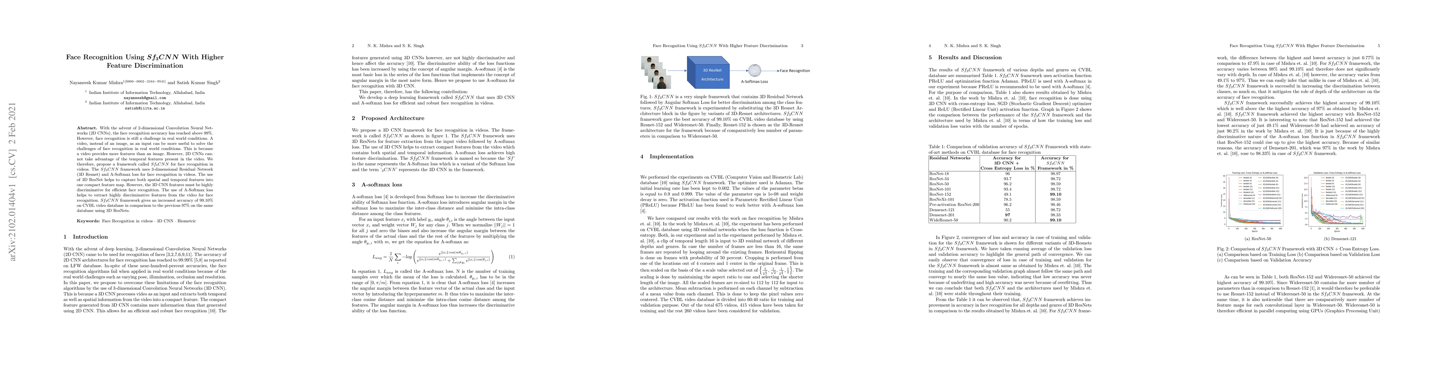 With the advent of 2-dimensional Convolution Neural Networks (2D CNNs), the face recognition accuracy has reached above 99%. However, face recognition is still a challenge in real world conditions. A video, instead of an image, as an input can be more useful to solve the challenges of face recognition in real world conditions. This is because a video provides more features than an image. However, 2D CNNs cannot take advantage of the temporal features present in the video. We therefore, propose a framework called $Sf_{3}CNN$ for face recognition in videos. The $Sf_{3}CNN$ framework uses 3-dimensional Residual Network (3D Resnet) and A-Softmax loss for face recognition in videos. The use of 3D ResNet helps to capture both spatial and temporal features into one compact feature map. However, the 3D CNN features must be highly discriminative for efficient face recognition. The use of A-Softmax loss helps to extract highly discriminative features from the video for face recognition. $Sf_{3}CNN$ framework gives an increased accuracy of 99.10% on CVBL video database in comparison to the previous 97% on the same database using 3D ResNets.