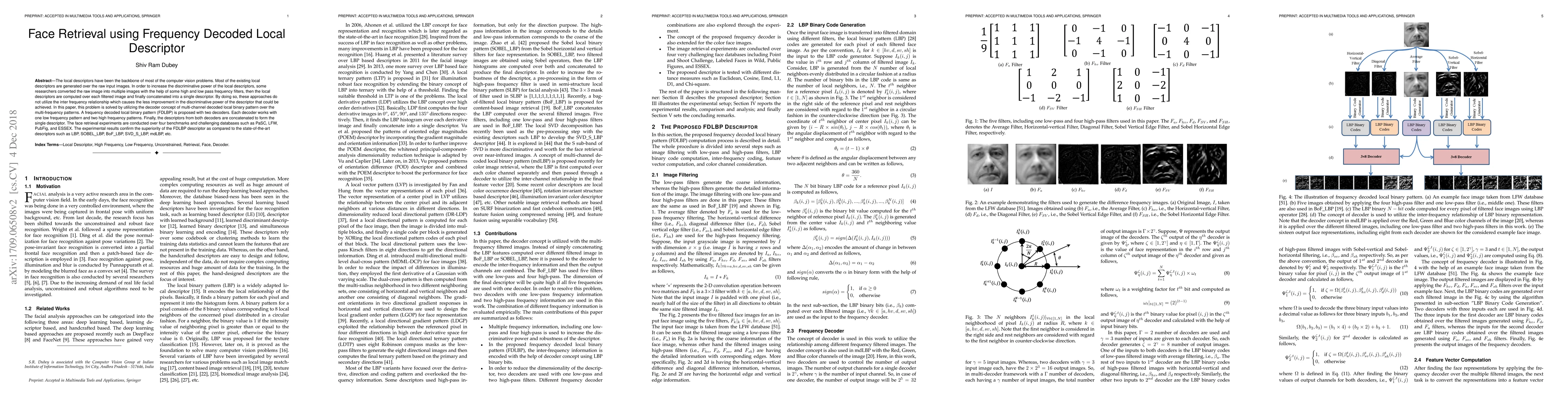 This paper proposes a frequency decoded local binary pattern (FDLBP) descriptor to enhance the discriminative power of local descriptors in face retrieval. The method utilizes two decoders to extract features from low and high frequency patterns, concatenating their outputs for improved performance, outperforming state-of-the-art methods on benchmark datasets.
