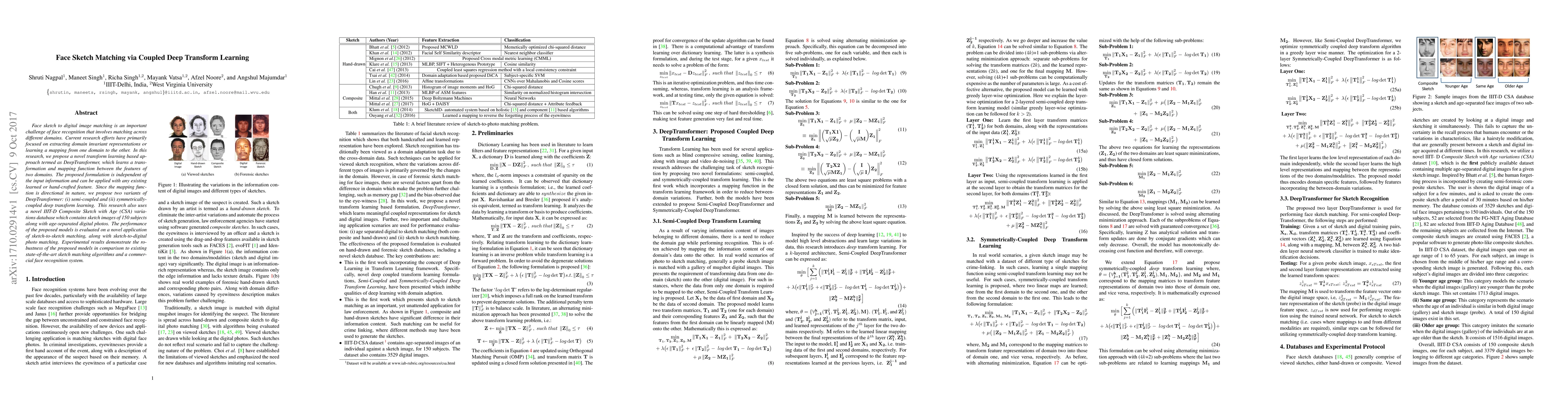 This research proposes a novel DeepTransformer approach for face sketch to digital image matching, utilizing coupled deep transform learning to map features across domains. Experimental results show superior performance compared to existing methods, validated on a new database with sketch and age-separated digital photos.