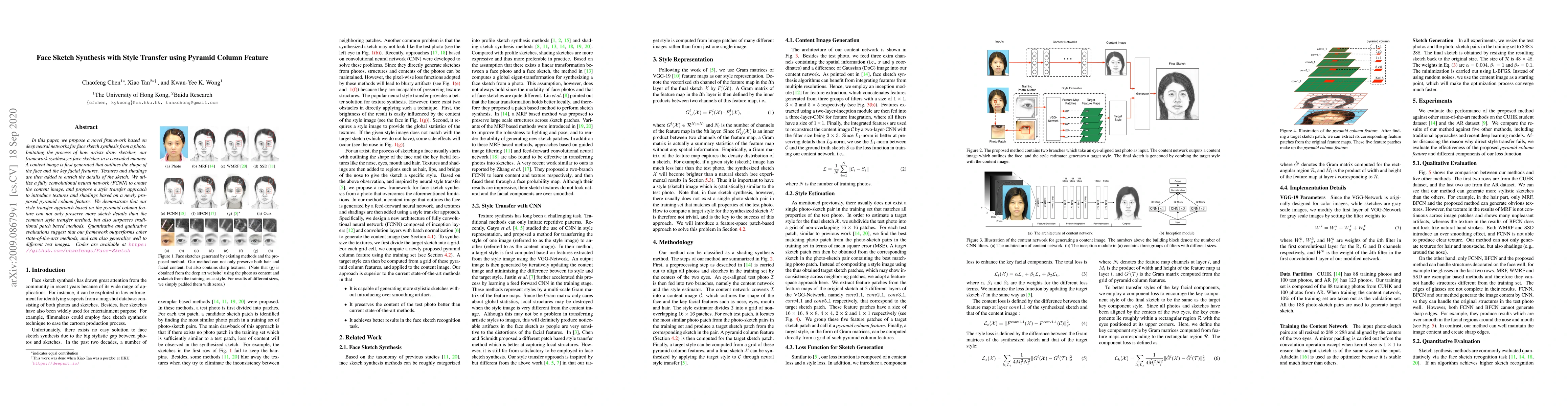 This paper introduces a deep neural network framework for synthesizing face sketches from photos using a cascaded approach. It employs a fully convolutional neural network for initial sketch generation and a novel style transfer method based on pyramid column features to add textures and shadings, outperforming traditional patch-based methods.