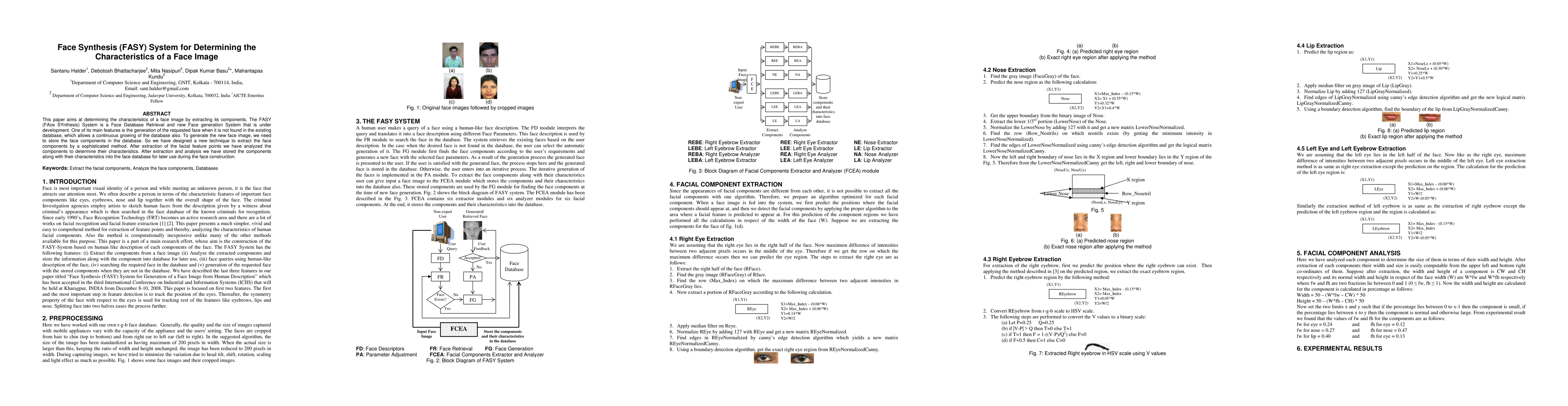 This paper aims at determining the characteristics of a face image by extracting its components. The FASY (FAce SYnthesis) System is a Face Database Retrieval and new Face generation System that is under development. One of its main features is the generation of the requested face when it is not found in the existing database, which allows a continuous growing of the database also. To generate the new face image, we need to store the face components in the database. So we have designed a new technique to extract the face components by a sophisticated method. After extraction of the facial feature points we have analyzed the components to determine their characteristics. After extraction and analysis we have stored the components along with their characteristics into the face database for later use during the face construction.