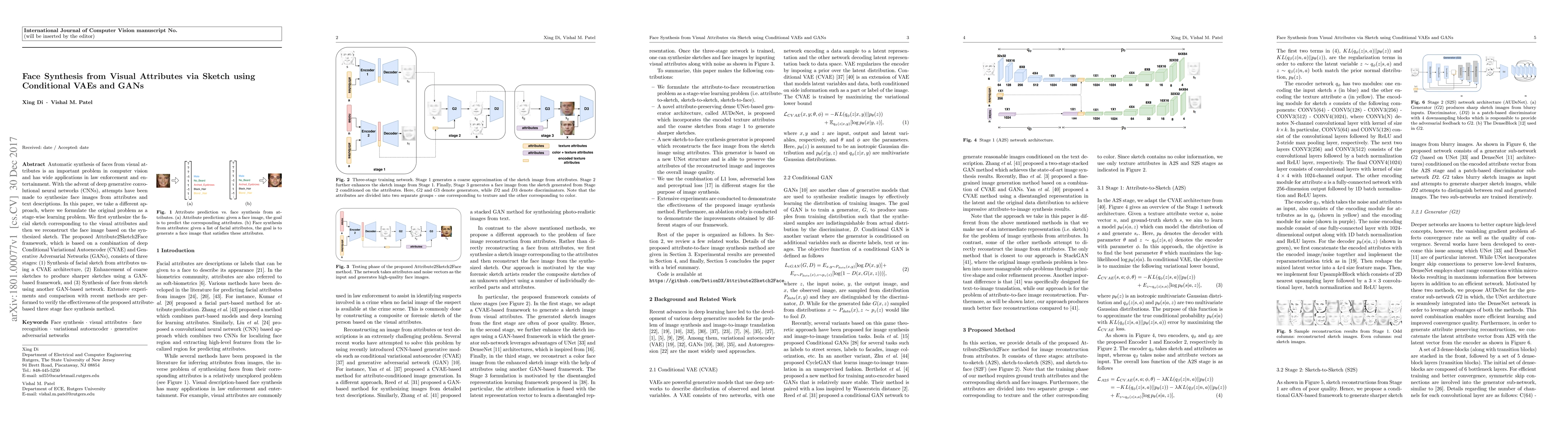 This paper proposes an Attribute2Sketch2Face framework for synthesizing faces from visual attributes using a three-stage process involving Conditional Variational Autoencoders and Generative Adversarial Networks. The method synthesizes facial sketches from attributes, enhances them to produce sharper sketches, and finally generates face images from the sketches.