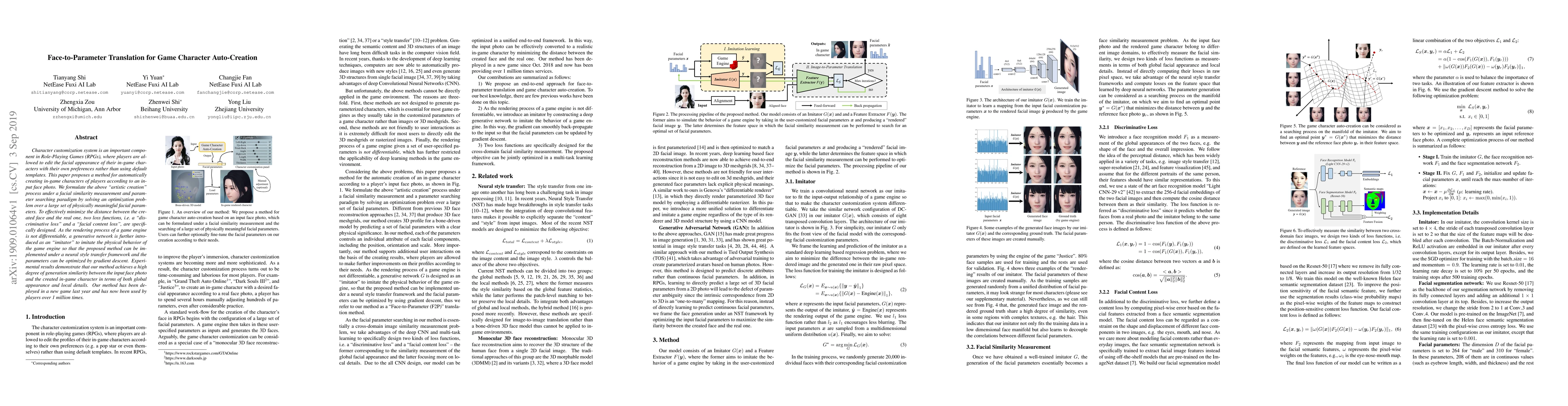 This paper proposes a method for automatically generating in-game characters based on player-provided face photos, optimizing facial parameters to minimize differences using discriminative and facial content loss functions. The method employs a generative network to mimic the game engine's rendering process, achieving high similarity in both global appearance and local details, as demonstrated by over 1 million player uses in a new game.