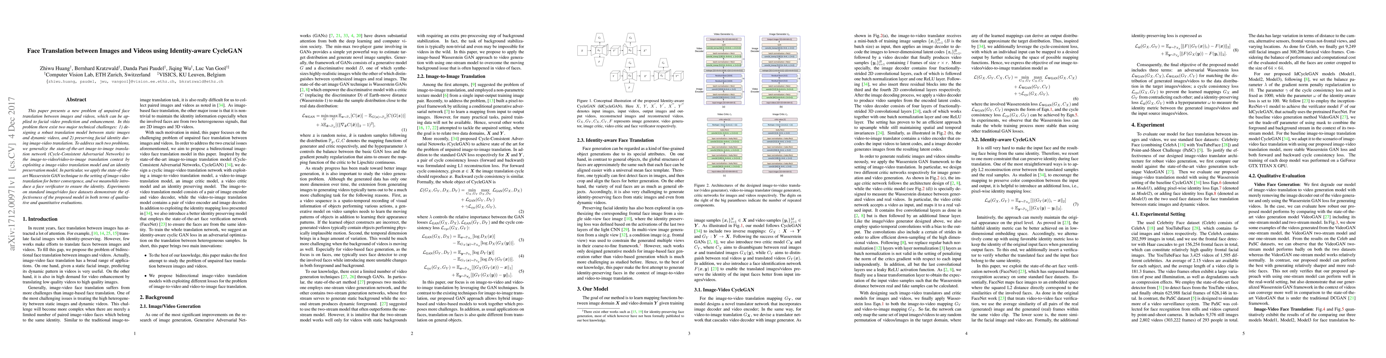 This paper proposes a method for unpaired face translation between images and videos using an Identity-aware CycleGAN, addressing challenges in robust translation and identity preservation. The approach leverages a Wasserstein GAN for better convergence and a face verificator for identity consistency, validated through qualitative and quantitative experiments.