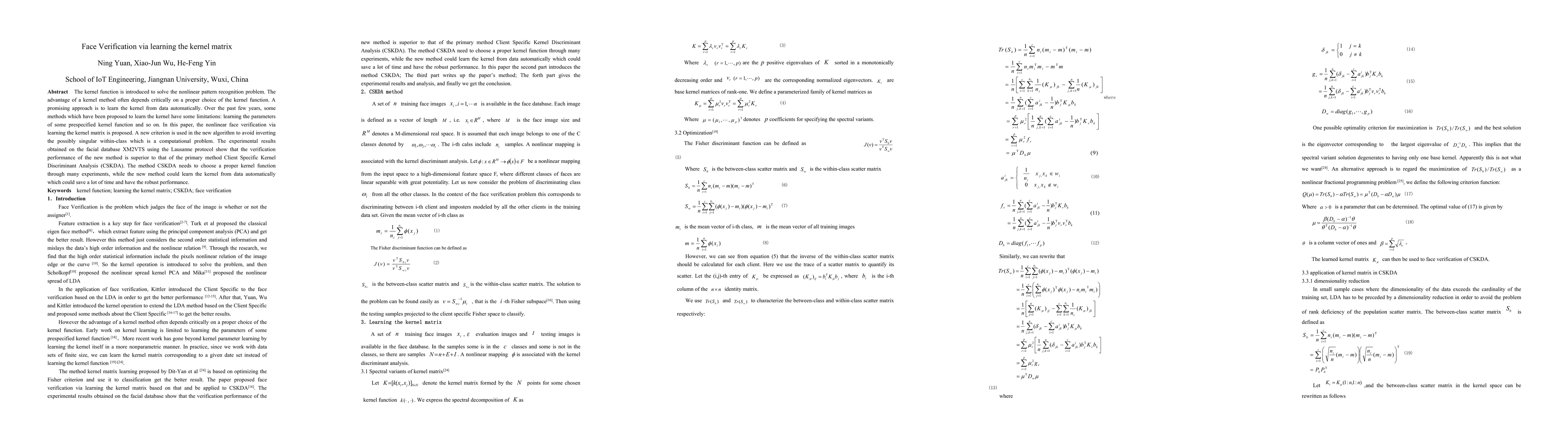 The technical contribution of this paper lies in the proposal of a novel face verification method via learning the kernel matrix, accompanied by a new criterion to avoid inverting a possibly singular within-class matrix.