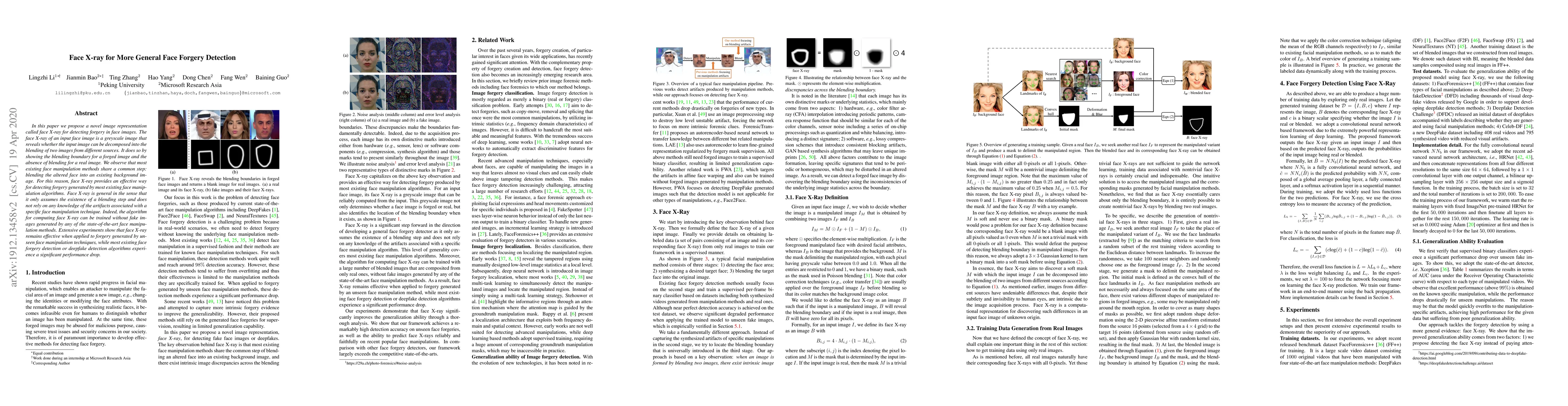 In this paper we propose a novel image representation called face X-ray for detecting forgery in face images. The face X-ray of an input face image is a greyscale image that reveals whether the input image can be decomposed into the blending of two images from different sources. It does so by showing the blending boundary for a forged image and the absence of blending for a real image. We observe that most existing face manipulation methods share a common step: blending the altered face into an existing background image. For this reason, face X-ray provides an effective way for detecting forgery generated by most existing face manipulation algorithms. Face X-ray is general in the sense that it only assumes the existence of a blending step and does not rely on any knowledge of the artifacts associated with a specific face manipulation technique. Indeed, the algorithm for computing face X-ray can be trained without fake images generated by any of the state-of-the-art face manipulation methods. Extensive experiments show that face X-ray remains effective when applied to forgery generated by unseen face manipulation techniques, while most existing face forgery detection or deepfake detection algorithms experience a significant performance drop.