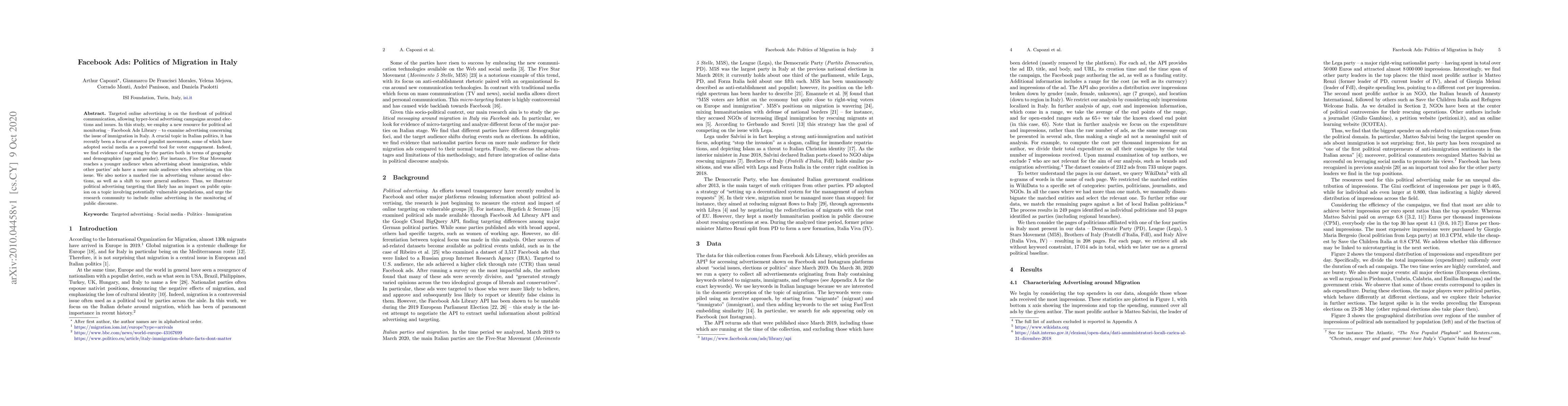 Targeted online advertising is on the forefront of political communication, allowing hyper-local advertising campaigns around elections and issues. In this study, we employ a new resource for political ad monitoring -- Facebook Ads Library -- to examine advertising concerning the issue of immigration in Italy. A crucial topic in Italian politics, it has recently been a focus of several populist movements, some of which have adopted social media as a powerful tool for voter engagement. Indeed, we find evidence of targeting by the parties both in terms of geography and demographics (age and gender). For instance, Five Star Movement reaches a younger audience when advertising about immigration, while other parties' ads have a more male audience when advertising on this issue. We also notice a marked rise in advertising volume around elections, as well as a shift to more general audience. Thus, we illustrate political advertising targeting that likely has an impact on public opinion on a topic involving potentially vulnerable populations, and urge the research community to include online advertising in the monitoring of public discourse.
