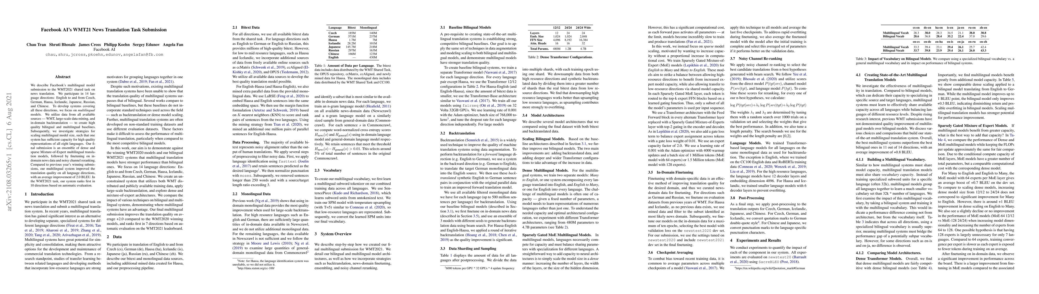 Facebook's submission to the WMT2021 news translation task employs multilingual models and an ensemble of Mixture-of-Expert models, achieving an average 2.0 BLEU improvement and ranking first in 10 of the 14 language directions. The system leverages extensive data sources and finetuning on in-domain news data for enhanced translation quality.
