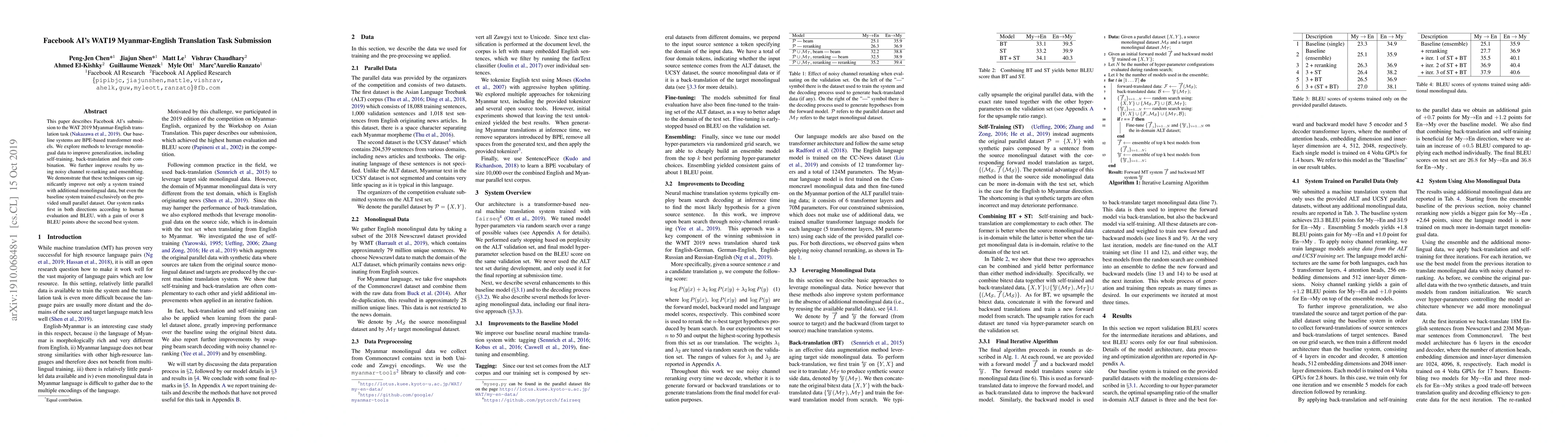 Facebook AI's submission to the WAT 2019 Myanmar-English translation task employs BPE-based transformer models enhanced by self-training, back-translation, and noisy channel re-ranking. These methods significantly improve translation quality, securing first place with an 8-point BLEU score advantage over the second-best system.