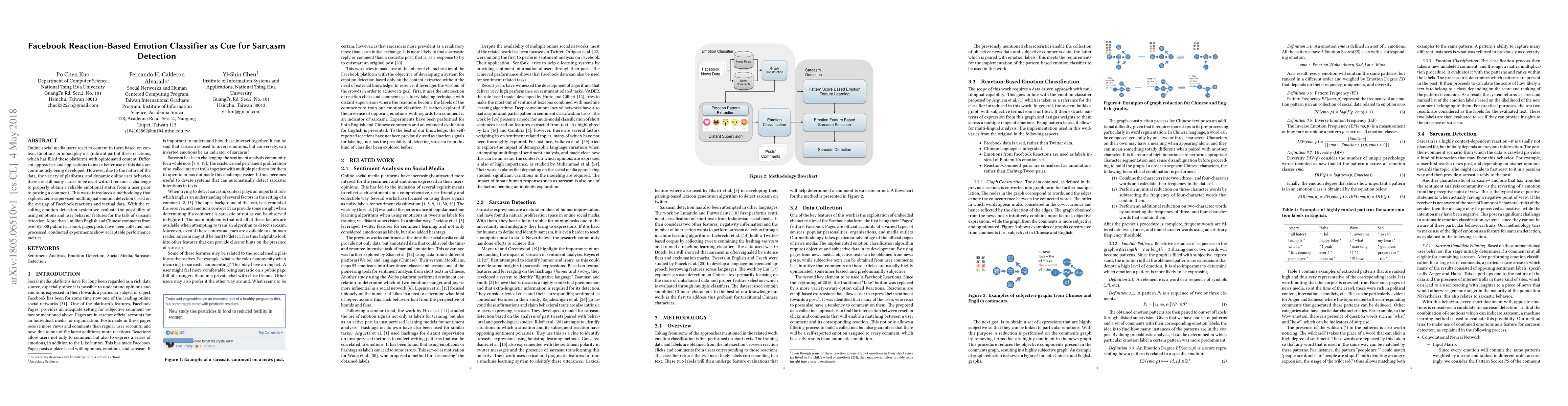 Online social media users react to content in them based on context. Emotions or mood play a significant part of these reactions, which has filled these platforms with opinionated content. Different approaches and applications to make better use of this data are continuously being developed. However, due to the nature of the data, the variety of platforms, and dynamic online user behavior, there are still many issues to be dealt with. It remains a challenge to properly obtain a reliable emotional status from a user prior to posting a comment. This work introduces a methodology that explores semi-supervised multilingual emotion detection based on the overlap of Facebook reactions and textual data. With the resulting emotion detection system we evaluate the possibility of using emotions and user behavior features for the task of sarcasm detection. More than 1 million English and Chinese comments from over 62,000 public Facebook pages posts have been collected and processed, conducted experiments show acceptable performance metrics.