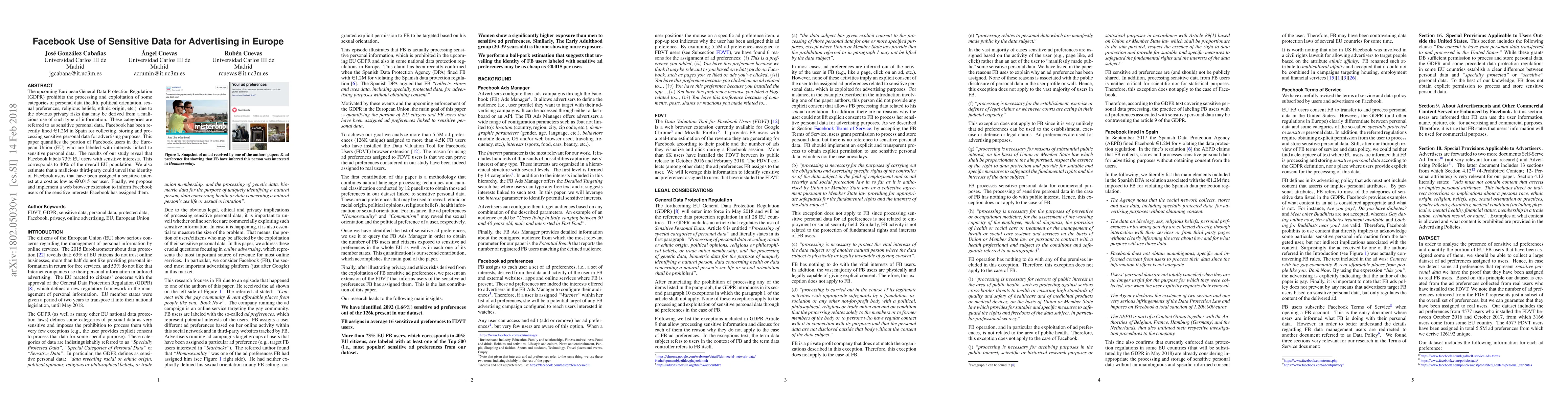 This paper investigates the extent of Facebook's use of sensitive personal data for advertising in the EU, revealing that 73% of users are labeled with such interests, equating to 40% of the EU population. It also estimates the low cost for malicious actors to reveal these identities, and proposes a browser extension to notify users of their assigned sensitive interests.