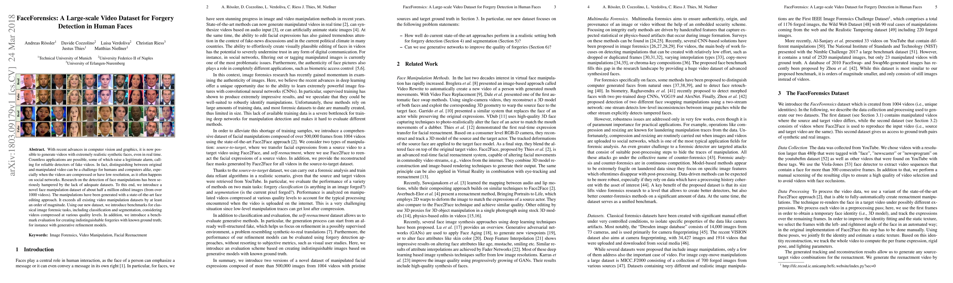 With recent advances in computer vision and graphics, it is now possible to generate videos with extremely realistic synthetic faces, even in real time. Countless applications are possible, some of which raise a legitimate alarm, calling for reliable detectors of fake videos. In fact, distinguishing between original and manipulated video can be a challenge for humans and computers alike, especially when the videos are compressed or have low resolution, as it often happens on social networks. Research on the detection of face manipulations has been seriously hampered by the lack of adequate datasets. To this end, we introduce a novel face manipulation dataset of about half a million edited images (from over 1000 videos). The manipulations have been generated with a state-of-the-art face editing approach. It exceeds all existing video manipulation datasets by at least an order of magnitude. Using our new dataset, we introduce benchmarks for classical image forensic tasks, including classification and segmentation, considering videos compressed at various quality levels. In addition, we introduce a benchmark evaluation for creating indistinguishable forgeries with known ground truth; for instance with generative refinement models.