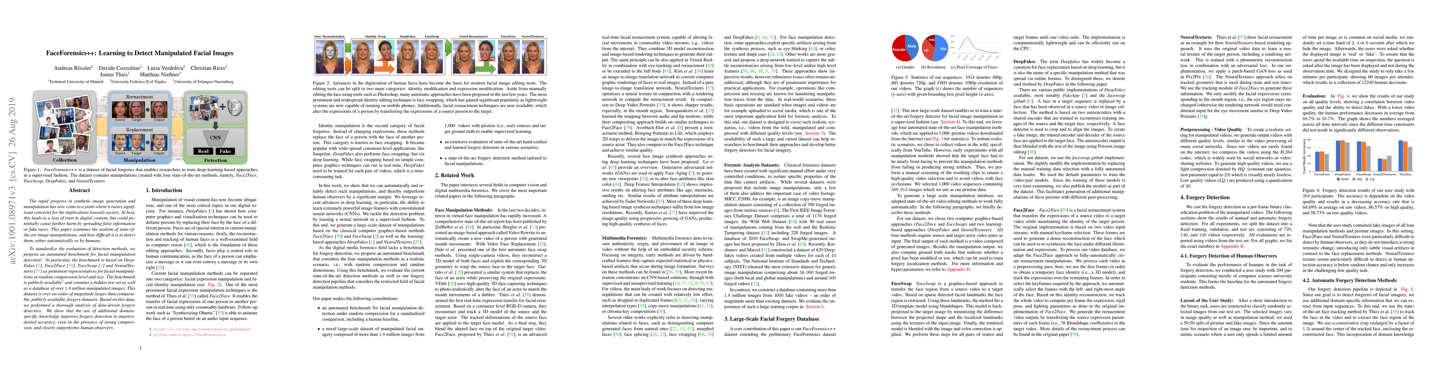This paper proposes a new benchmark for detecting manipulated facial images using DeepFakes, Face2Face, FaceSwap, and NeuralTextures. It introduces a large dataset of over 1.8 million images and analyzes the effectiveness of data-driven forgery detectors, showing that domain-specific knowledge can significantly improve detection accuracy beyond human capability.