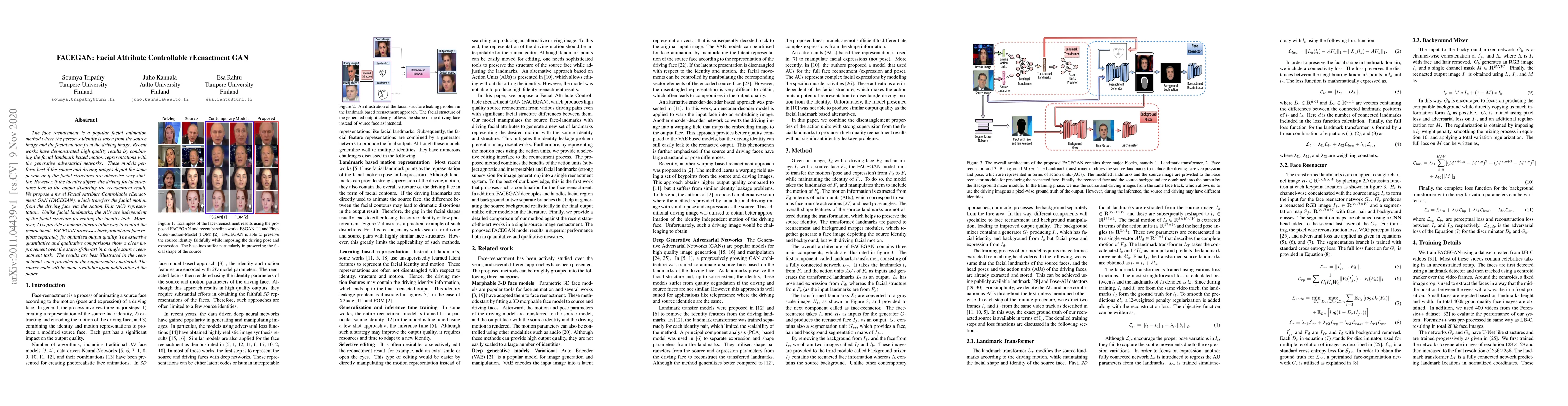 FACEGAN is a novel GAN that uses Action Unit representations to transfer facial motion between different identities, preventing identity distortion. It processes background and face regions separately for enhanced quality, outperforming state-of-the-art methods in single source reenactment tasks.