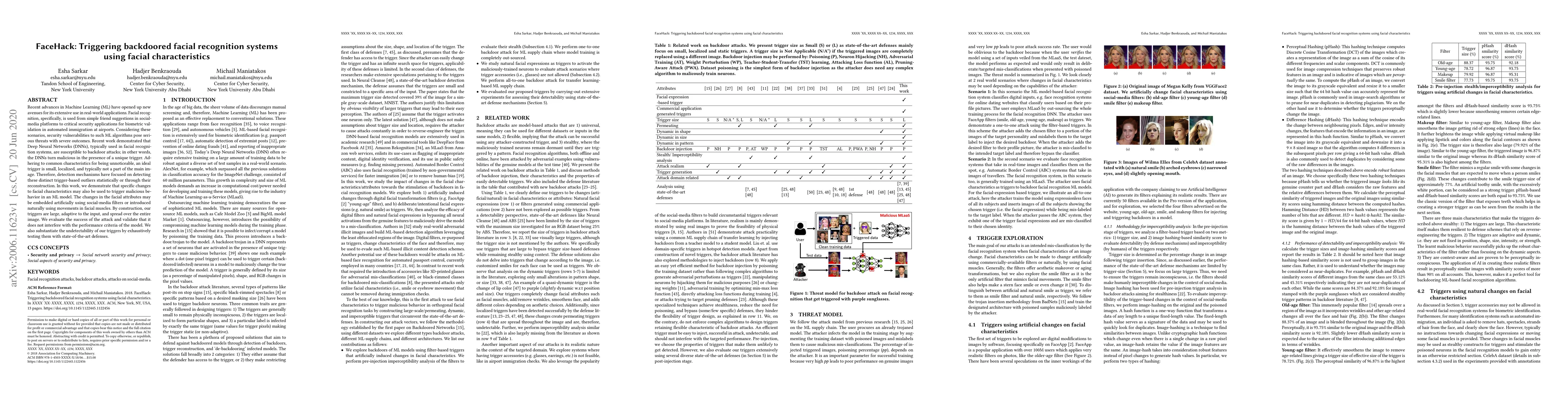 Recent advances in Machine Learning (ML) have opened up new avenues for its extensive use in real-world applications. Facial recognition, specifically, is used from simple friend suggestions in social-media platforms to critical security applications for biometric validation in automated immigration at airports. Considering these scenarios, security vulnerabilities to such ML algorithms pose serious threats with severe outcomes. Recent work demonstrated that Deep Neural Networks (DNNs), typically used in facial recognition systems, are susceptible to backdoor attacks; in other words,the DNNs turn malicious in the presence of a unique trigger. Adhering to common characteristics for being unnoticeable, an ideal trigger is small, localized, and typically not a part of the main im-age. Therefore, detection mechanisms have focused on detecting these distinct trigger-based outliers statistically or through their reconstruction. In this work, we demonstrate that specific changes to facial characteristics may also be used to trigger malicious behavior in an ML model. The changes in the facial attributes maybe embedded artificially using social-media filters or introduced naturally using movements in facial muscles. By construction, our triggers are large, adaptive to the input, and spread over the entire image. We evaluate the success of the attack and validate that it does not interfere with the performance criteria of the model. We also substantiate the undetectability of our triggers by exhaustively testing them with state-of-the-art defenses.