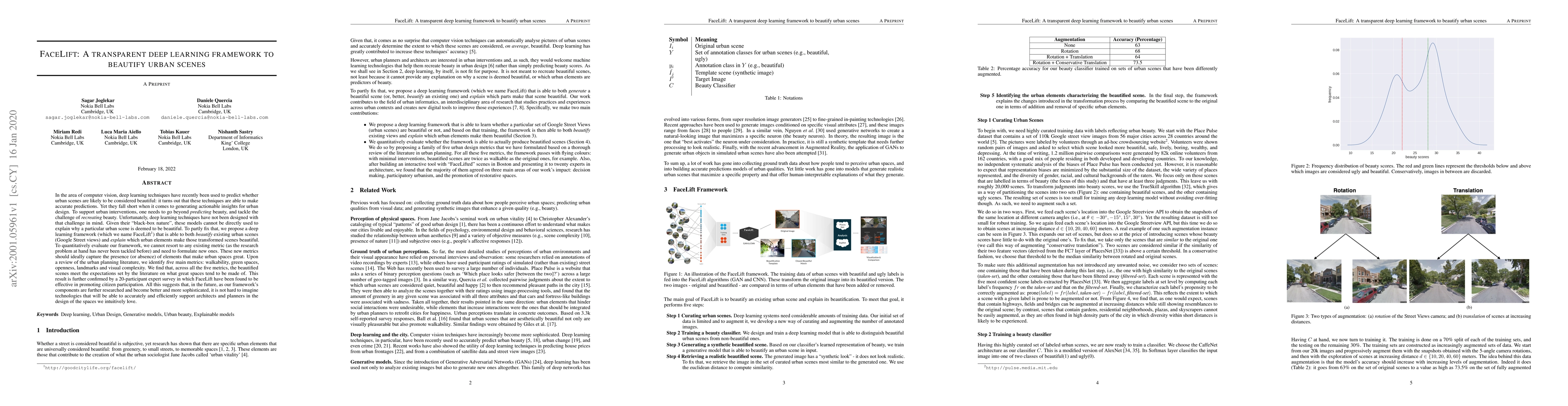 The Facelift framework uses deep learning to beautify urban scenes and explain the factors contributing to beauty, addressing the limitations of existing black-box models. It evaluates its effectiveness through new metrics based on urban planning literature and expert surveys, showing promising results in promoting citizen participation and urban design.