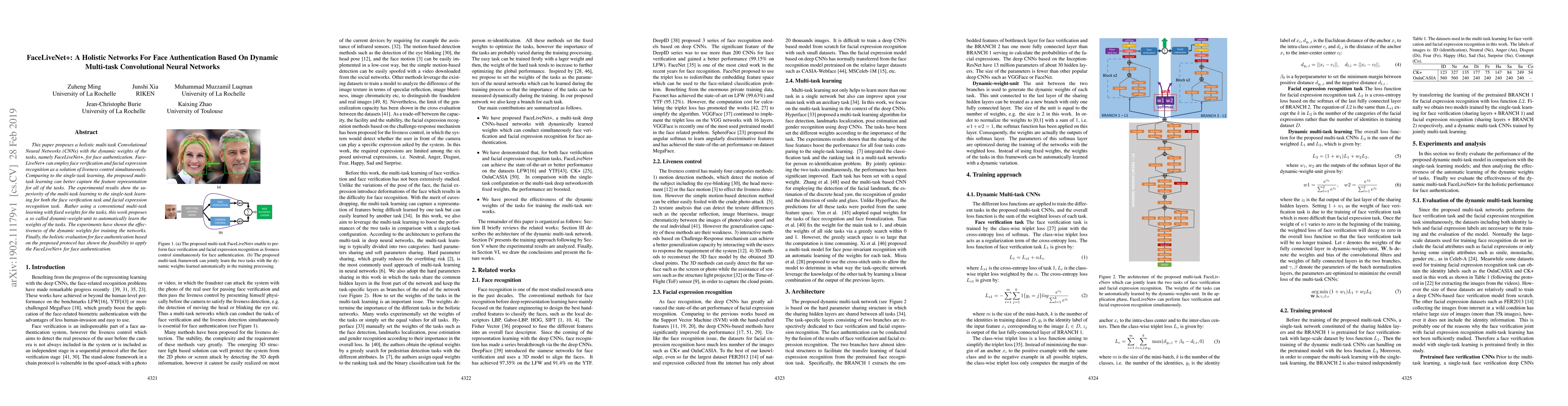 This paper proposes a holistic multi-task Convolutional Neural Networks (CNNs) with the dynamic weights of the tasks,namely FaceLiveNet+, for face authentication. FaceLiveNet+ can employ face verification and facial expression recognition as a solution of liveness control simultaneously. Comparing to the single-task learning, the proposed multi-task learning can better capture the feature representation for all of the tasks. The experimental results show the superiority of the multi-task learning to the single-task learning for both the face verification task and facial expression recognition task. Rather using a conventional multi-task learning with fixed weights for the tasks, this work proposes a so called dynamic-weight-unit to automatically learn the weights of the tasks. The experiments have shown the effectiveness of the dynamic weights for training the networks. Finally, the holistic evaluation for face authentication based on the proposed protocol has shown the feasibility to apply the FaceLiveNet+ for face authentication.