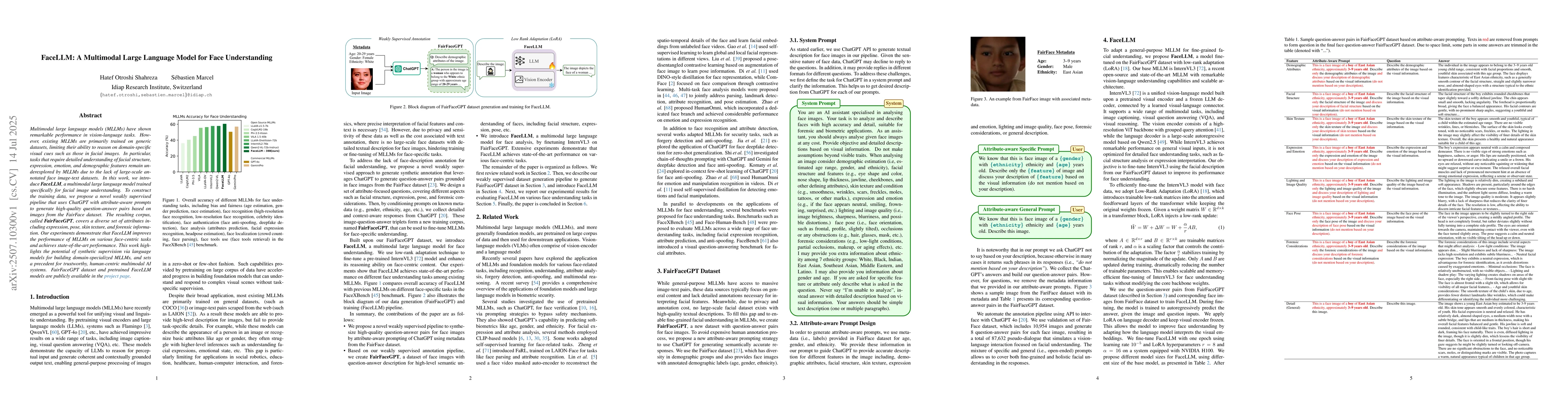 Multimodal large language models (MLLMs) have shown remarkable performance in vision-language tasks. However, existing MLLMs are primarily trained on generic datasets, limiting their ability to reason on domain-specific visual cues such as those in facial images. In particular, tasks that require detailed understanding of facial structure, expression, emotion, and demographic features remain underexplored by MLLMs due to the lack of large-scale annotated face image-text datasets. In this work, we introduce FaceLLM, a multimodal large language model trained specifically for facial image understanding. To construct the training data, we propose a novel weakly supervised pipeline that uses ChatGPT with attribute-aware prompts to generate high-quality question-answer pairs based on images from the FairFace dataset. The resulting corpus, called FairFaceGPT, covers a diverse set of attributes including expression, pose, skin texture, and forensic information. Our experiments demonstrate that FaceLLM improves the performance of MLLMs on various face-centric tasks and achieves state-of-the-art performance. This work highlights the potential of synthetic supervision via language models for building domain-specialized MLLMs, and sets a precedent for trustworthy, human-centric multimodal AI systems. FairFaceGPT dataset and pretrained FaceLLM models are publicly available in the project page.