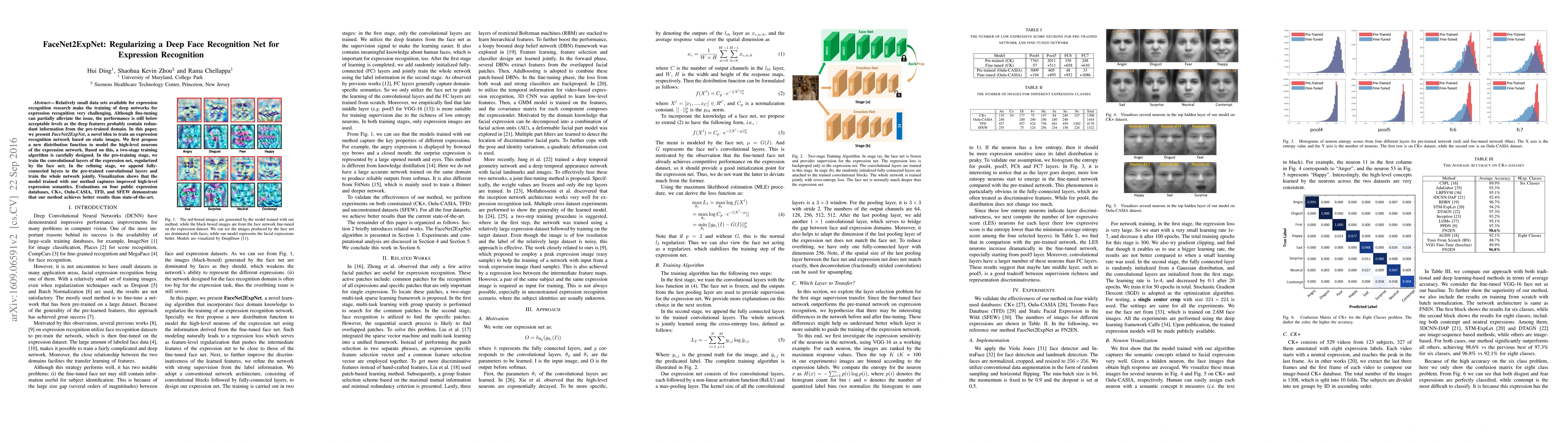 The paper introduces FaceNet2ExpNet, a method to train expression recognition networks from static images. It proposes a new distribution function for high-level neurons and a two-stage training algorithm. The first stage pre-trains convolutional layers with regularization from a face recognition net, while the second stage appends fully-connected layers and trains the whole network jointly. Results show improved high-level expression semantics and better performance on four public expression databases compared to existing methods.