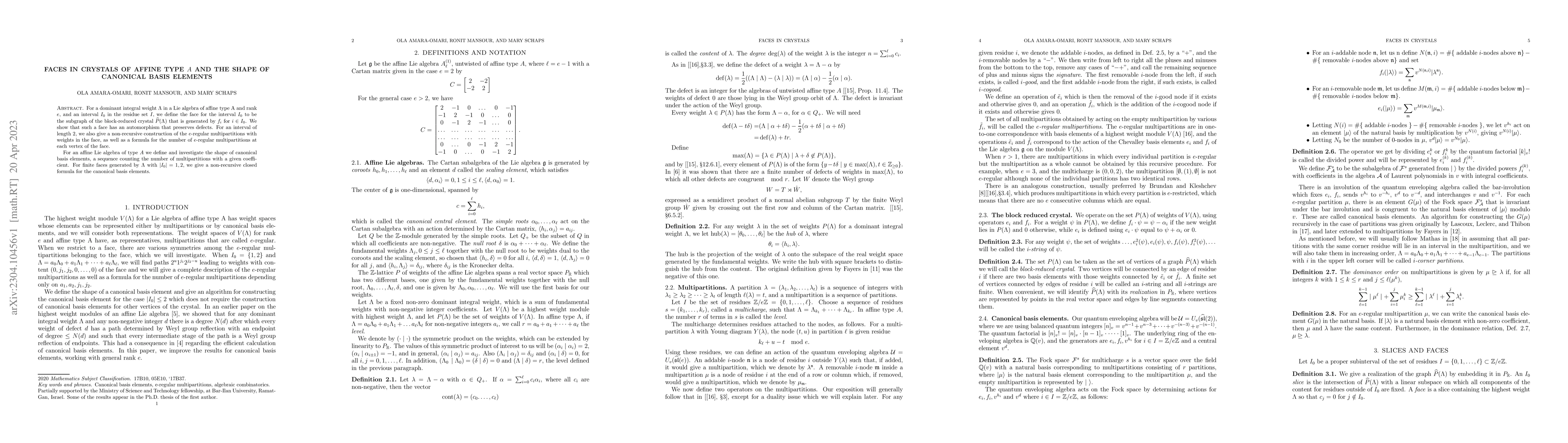 For a dominant integral weight $\Lambda$ in a Lie algebra of affine type A and rank $e$, and an interval $I_0$ in the residue set $I$, we define the face for the interval $I_0$ to be the subgraph of the block-reduced crystal $\widehat P(\Lambda)$ that is generated by $f_i$ for $i \in I_0$. We show that such a face has an automorphism that preserves defects. For an interval of length $2$, we also give a non-recursive construction of the $e$-regular multipartitions with weights in the face, as well as a formula for the number of $e$-regular multipartitions at each vertex of the face. For an affine Lie algebra of type $A$ we define and investigate the shape of canonical basis elements, a sequence counting the number of multipartitions with a given coefficient. For finite faces generated by $\Lambda$ with $|I_0|=1,2$, we give a non-recursive closed formula for the canonical basis elements.