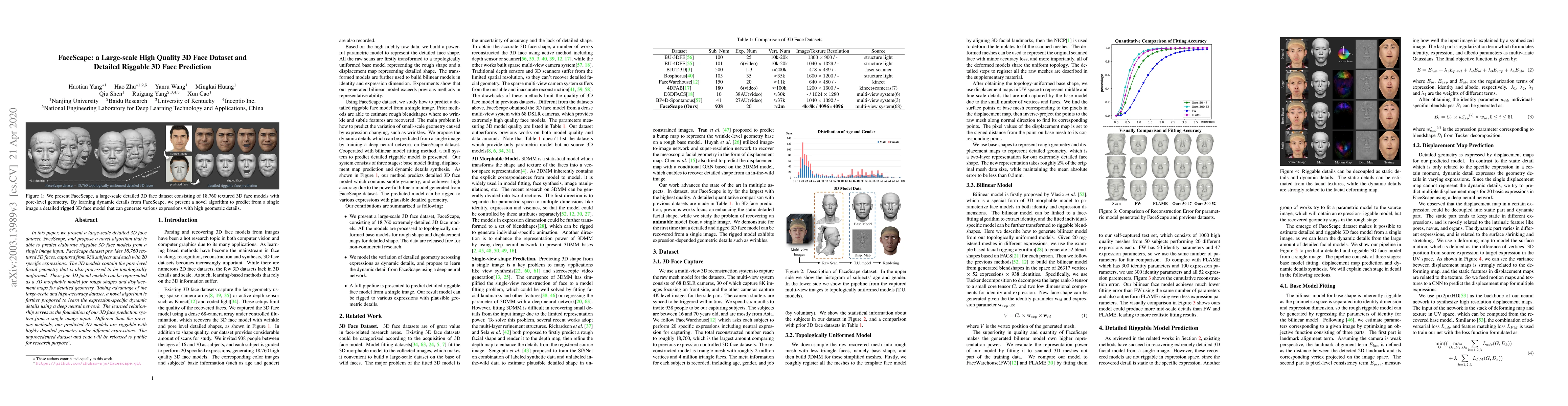 This paper introduces FaceScape, a large-scale 3D face dataset with 18,760 textured 3D faces from 938 subjects, and proposes an algorithm for predicting detailed riggable 3D face models from single images. The dataset's high-accuracy, pore-level geometry enables detailed 3D morphable models and displacement maps.