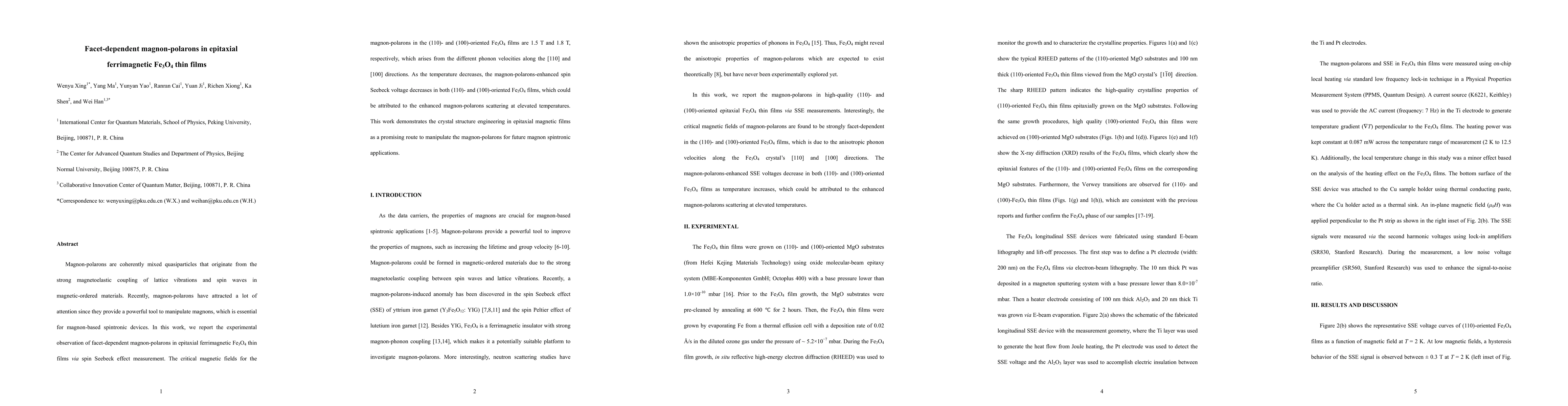 This study reports facet-dependent magnon-polarons in epitaxial ferrimagnetic Fe3O4 thin films, observed via spin Seebeck effect measurements, with differing critical magnetic fields for (110) and (100) orientations due to phonon velocity variations. Temperature-dependent experiments show a decrease in magnon-polarons-enhanced spin Seebeck voltage, indicating enhanced scattering at higher temperatures.