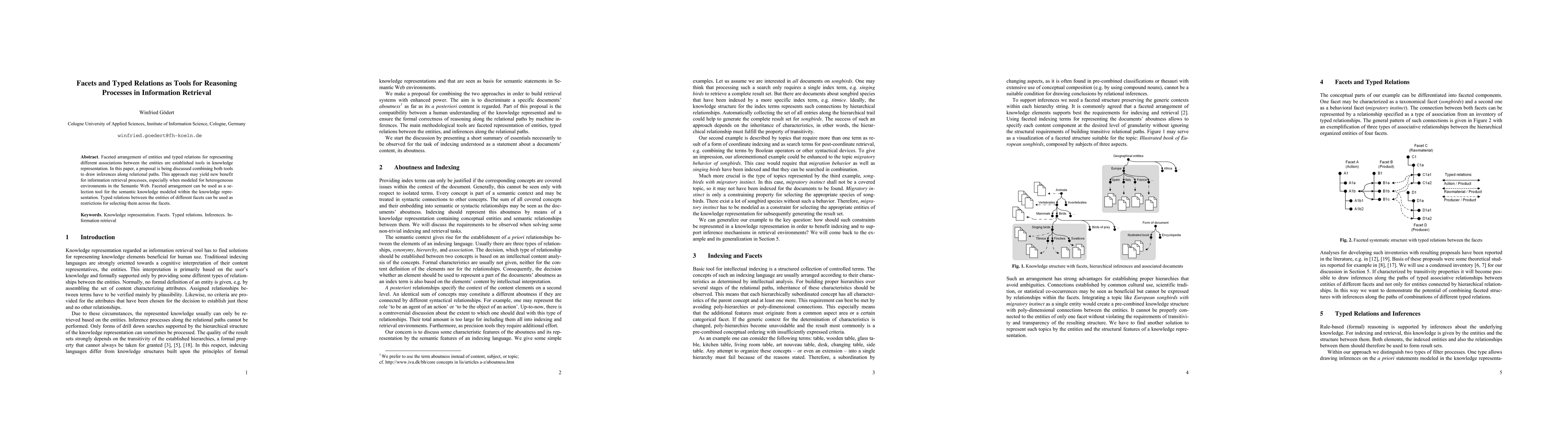 Faceted arrangement of entities and typed relations for representing different associations between the entities are established tools in knowledge representation. In this paper, a proposal is being discussed combining both tools to draw inferences along relational paths. This approach may yield new benefit for information retrieval processes, especially when modeled for heterogeneous environments in the Semantic Web. Faceted arrangement can be used as a se-lection tool for the semantic knowledge modeled within the knowledge repre-sentation. Typed relations between the entities of different facets can be used as restrictions for selecting them across the facets.