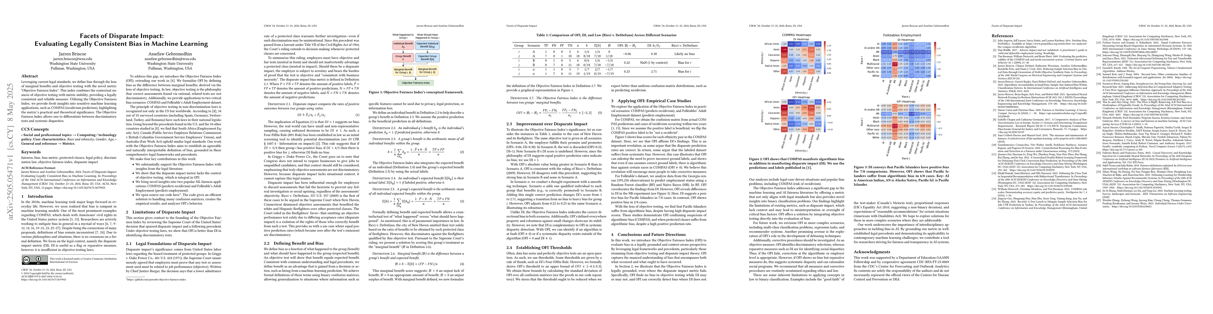 A new metric called the Objective Fairness Index is used to measure bias in machine learning models, providing a legally consistent way to identify disparate impact. This allows for differentiation between individual discriminatory tests and systemic disparities.