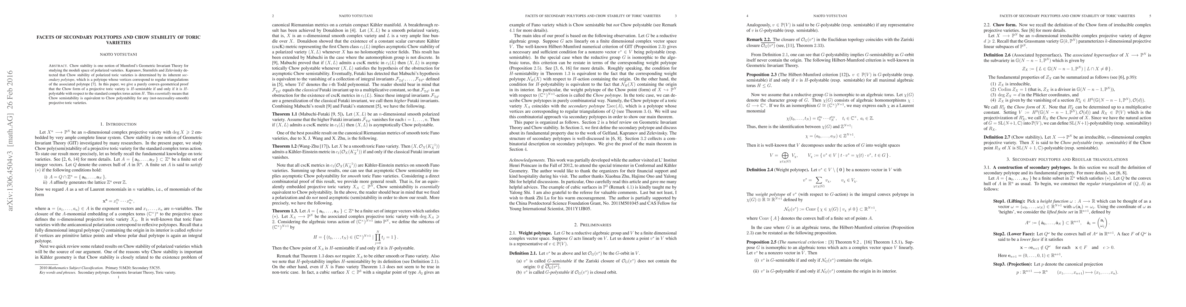 This paper presents a convex-geometrical proof for Chow stability in toric varieties, showing that Chow semistability is equivalent to Chow polystability. The authors leverage the concept of secondary polytopes, linking Chow stability to the regular triangulations of associated polytopes.