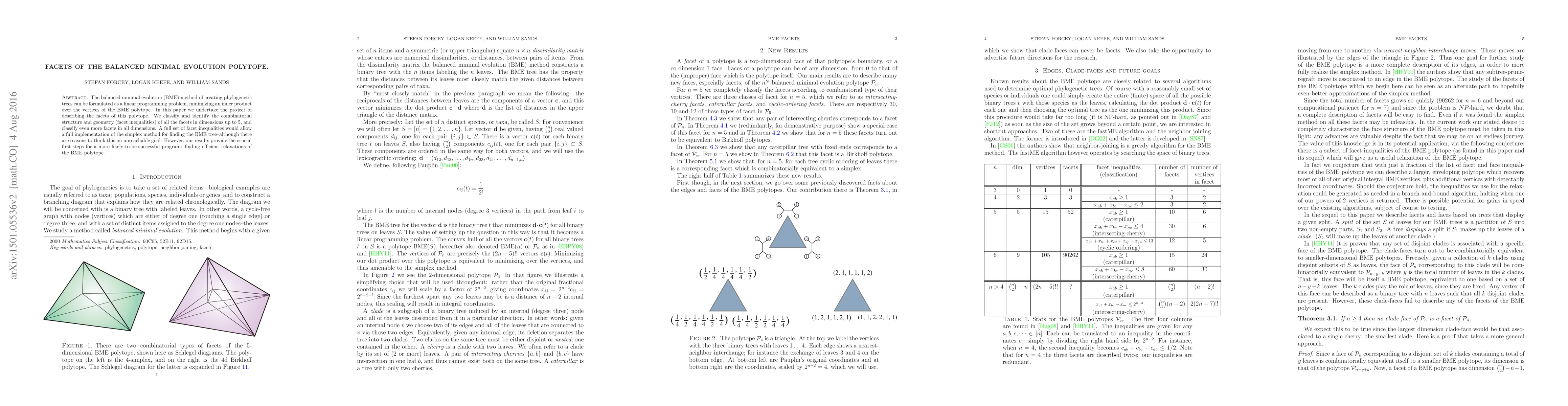 A phylogenetic tree is a way to organize a finite set of species, individuals or other sources of related data. The species for which we have existing DNA data make up the set of leaves of the tree. The balanced minimal evolution method of creating phylogenetic trees can be formulated as a linear programming problem, minimizing an inner product over the vertices of the BME polytope. In this paper we undertake the first steps of describing the facets of this polytope.