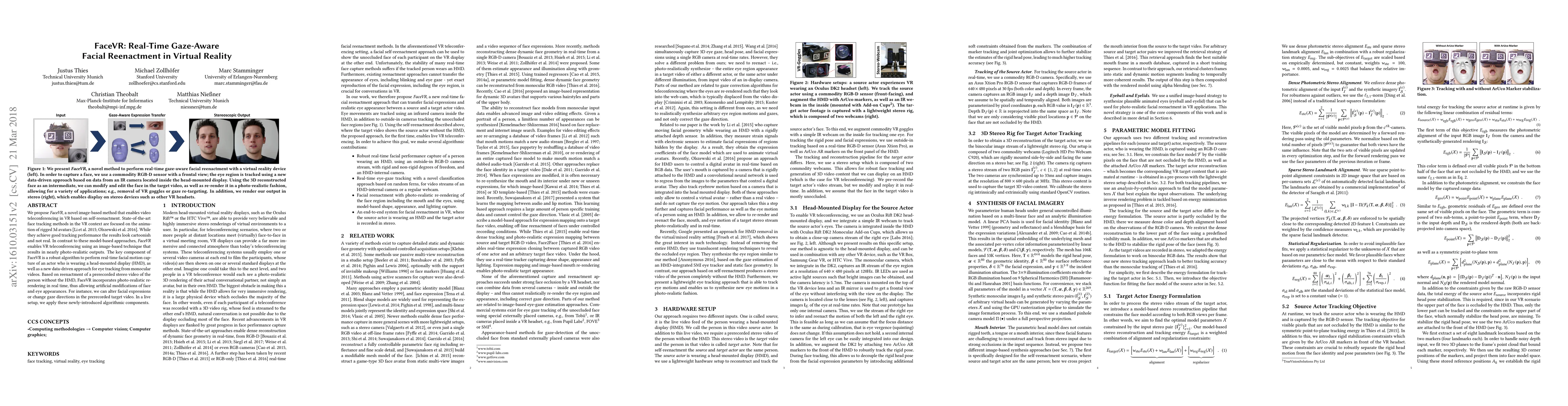 FaceVR presents an image-based method for nearly photo-realistic VR teleconferencing through real-time facial reenactment and eye gaze control, contrasting with cartoonish model-based approaches. It employs robust facial motion capture and a data-driven monocular eye-tracking technique to achieve artificial modifications of face and eye appearances in real time.