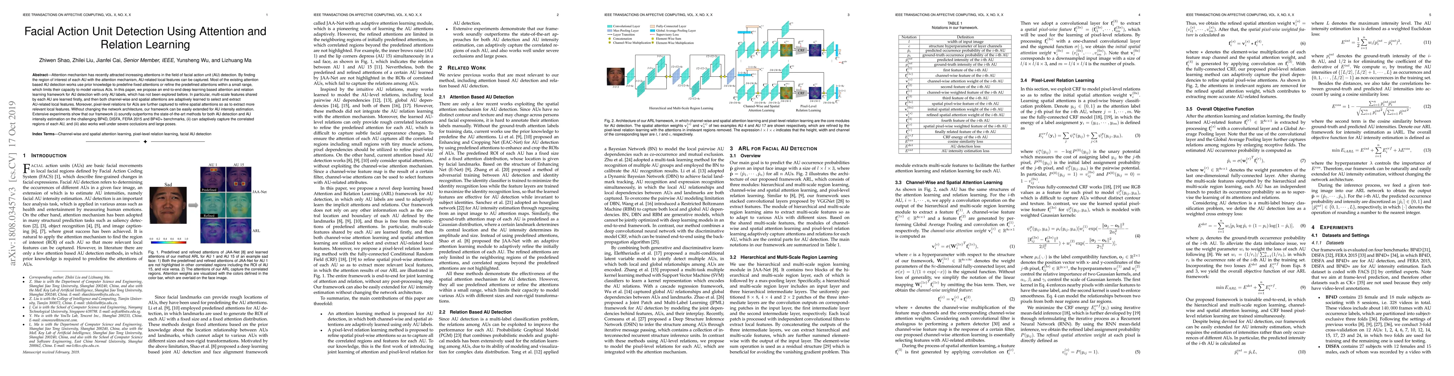 This paper proposes an end-to-end deep learning framework for facial action unit detection using adaptive attention and relation learning, outperforming state-of-the-art methods on multiple benchmarks. The framework captures multi-scale AU features and refines spatial attentions through pixel-level relations.