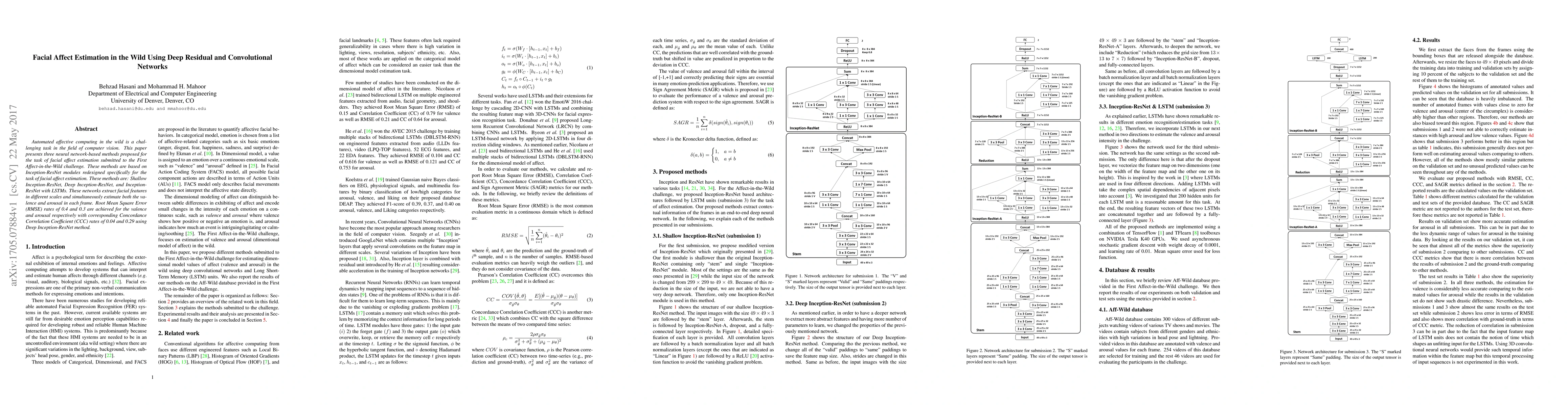 This paper proposes three neural network methods—Shallow Inception-ResNet, Deep Inception-ResNet, and Inception-ResNet with LSTMs—for facial affect estimation in real-world scenarios. The Deep Inception-ResNet method achieves the best performance with RMSE of 0.4 and 0.3 for valence and arousal, respectively, and CCC rates of 0.04 and 0.29.