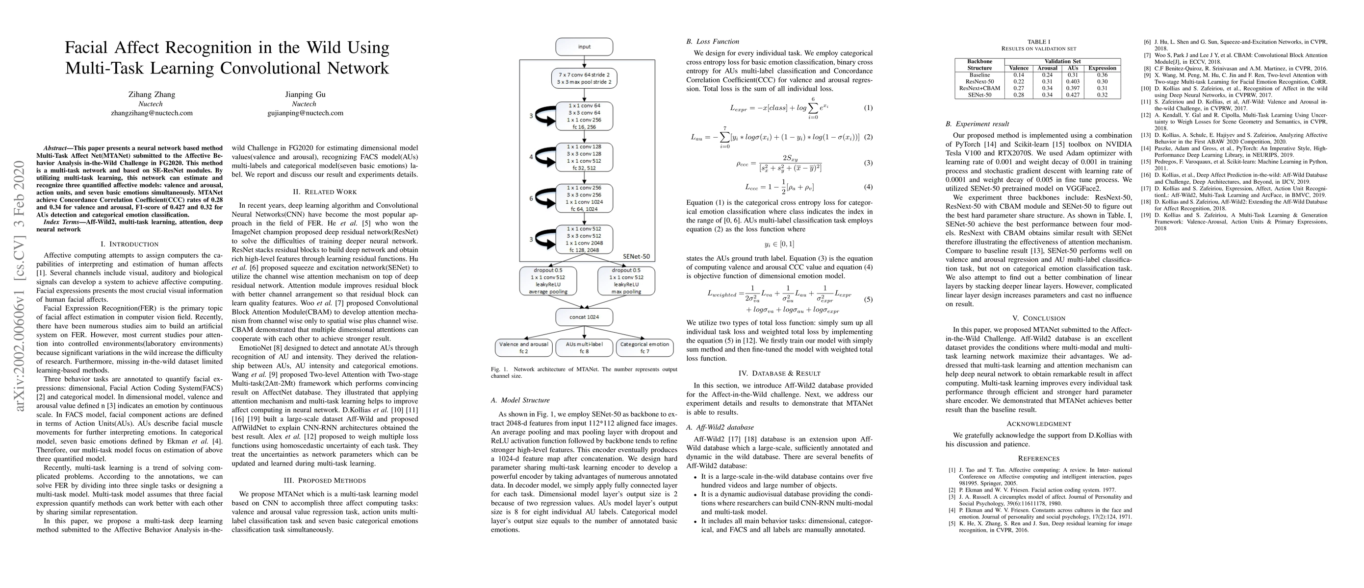 The paper introduces MTANet, a multi-task learning neural network using SE-ResNet modules for simultaneous valence, arousal, action units, and seven basic emotion recognition in wild scenarios. It achieves CCC rates of 0.28 and 0.34 for valence and arousal, and F1-scores of 0.427 and 0.32 for AUs detection and emotion classification.