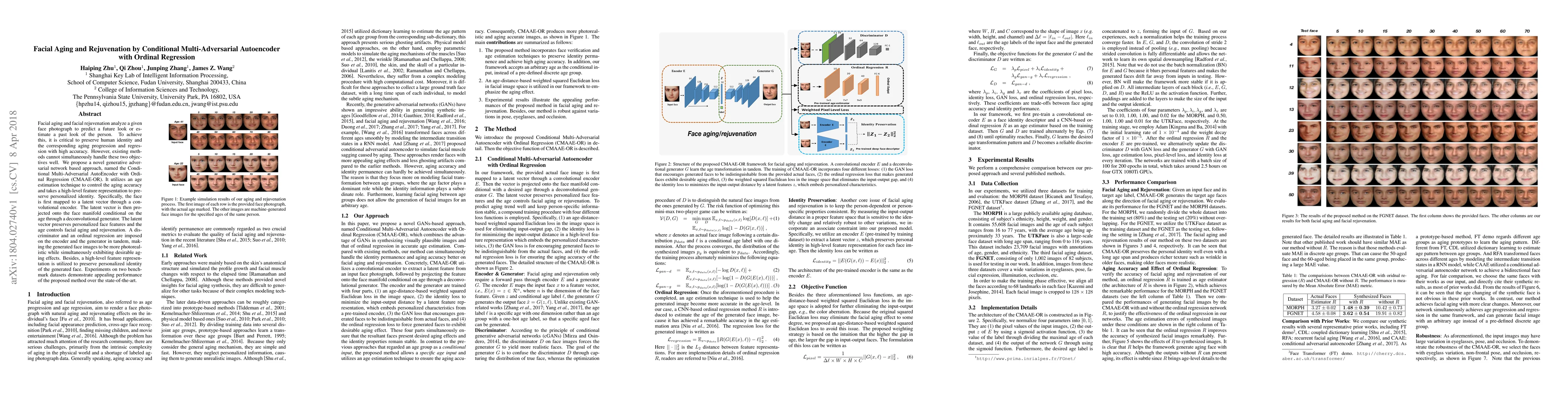 This paper proposes a novel Conditional Multi-Adversarial AutoEncoder with Ordinal Regression (CMAAE-OR) for facial aging and rejuvenation, aiming to accurately predict future or past looks while preserving identity. The method uses a generative adversarial network to control aging effects and high-level features to maintain personalized face characteristics, outperforming existing techniques on benchmark datasets.